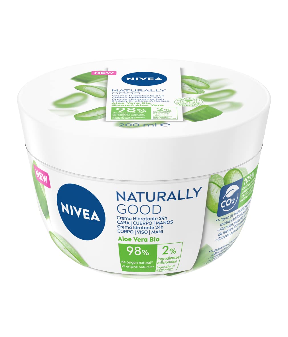 NIVEA NATURALY Good Good-Special moisturizer- body, face and hand cream with aloe vera NIVEA NATURALY Good Good Moistability Cream is suitable for the skin of the face, hands and body.Thanks to its vegan formula with aloe vera and 98 natural ingredients this all -purpose cream protects the environment.Nivea Naturally Good Creme has a light texture, does not stick and donates moisture for 24 hours for a smooth and dry skin. Skin compatibility dermatologically approved. Product advantages: Multifunctional moisturizer for face, hands and body For a fresh and soft feeling Formula enriched with aloe vera Light texture For everyday use Vegan Water included Formula without animal ingredientsdelivery-Nivea Naturally Good moisturizer, multi-purpose moisture cream, body cream, face and hands, aloe vera, can 200 ml, article no.85855. Vegan formula - the formula of the Nivea cream is vegan and consists of 98 natural ingredients for sustainable body care.24H moisture- this refreshing body, face and hand cream donates moisture 24 hours, absorbs quickly and does not grease, for fresh and dry skin.Aloe Vera - The formula of the cream is enriched with aloe vera, an ingredient that cares thoroughly and has a soothing effect, which makes the skin long -lasting.Multi -purpose cream - the Naturally Good Moisturability Cream for Hands, Face and Body maintains every skin type thanks to its moisturizing properties.NIVEA NATURALLY GOOD Mehrzweck-Feuchtigkeitscreme - Körper-, Gesichts- und Handcreme mit Aloe Vera NIVEA NATURALLY GOOD Mehrzweck-Feuchtigkeitscreme ist geeignet für die Haut von Gesicht, Händen und Körper. Dank ihrer veganen Formel mit Aloe Vera und 98 natürlichen Inhaltsstoffen schont diese Allzweckcreme die Umwelt. NIVEA Naturally Good Creme hat eine leichte Textur, klebt nicht und spendet 24 Stunden Feuchtigkeit für eine geschmeidige und trockene Haut. Hautverträglichkeit dermatologisch bestätigt. Produktvorteile: Multifunktionale Feuchtigkeitscreme für Gesicht, Hände und Körper Für ein frisches und weiches Gefühl Formel angereichert mit Aloe Vera Leichte Textur Für den täglichen Gebrauch Vegan Wasser inbegriffen Formel ohne tierische InhaltsstoffeLIEFERUMFANG - NIVEA NATURALLY GOOD Feuchtigkeitscreme, Mehrzweck-Feuchtigkeitscreme, Körpercreme, Gesicht und Hände, Aloe Vera, Dose 200 ml, Artikel-Nr. 85855. Vegane Formel - Die Formel der NIVEA Creme ist vegan und besteht zu 98 aus natürlichen Inhaltsstoffen für eine nachhaltige Körperpflege. 24h Feuchtigkeit - Diese erfrischende Körper-, Gesichts- und Handcreme spendet 24 Stunden Feuchtigkeit, zieht schnell ein und fettet nicht, für eine frische und trockene Haut. Aloe Vera - Die Formel der Creme ist angereichert mit Aloe Vera, einem Inhaltsstoff, der gründlich pflegt und beruhigend wirkt, die die Haut langanhaltend weich macht. Mehrzweckcreme - Die NATURALLY GOOD Feuchtigkeitscreme für Hände, Gesicht und Körper pflegt jeden Hauttyp dank ihrer feuchtigkeitsspendenden Eigenschaften.NIVEA NATURALLY GOOD Mehrzweck-Feuchtigkeitscreme 200 ml, Hand- und Körpercreme mit pflegender Aloe Vera, sanfte Mehrzweck-Gesichts- und Körpercreme mit veganer Formel