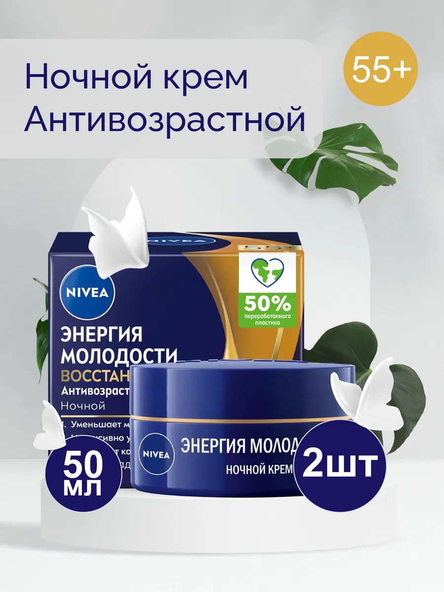 Ночной крем Nivea Энергия Молодости Восстановление 55+. В наборе 2 штуки по 50 мл. Заметно сокращает поверхностные и глубокие морщины, укрепляет и повышает тонус, стимулирует естественный процесс восстановления во время сна. В составе содержатся натуральное масло авокадо, кальций и пантенол для интенсивного увлажнения. Рекомендуется наносить каждый вечер, легкими массажными движениями на очищенную кожу лица и шеи. Избегайте область вокруг глаз. Формула не содержит микропластик, а баночка сделана из 50% переработанных материалов.