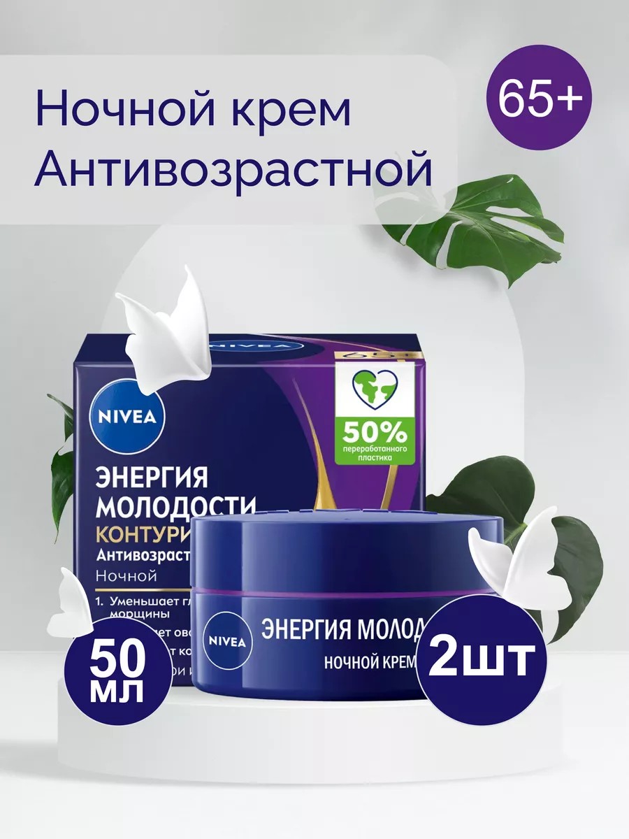 Ночной крем Nivea Энергия Молодости Контуринг 65+. В наборе 2 штуки по 50 мл. Средство способствует процессу регенерации требовательной зрелой кожи, заметно уменьшает поверхностные и глубокие морщины и стимулирует процесс обновления в ночное время. Содержит экстракт сои, масло жожоба и пантенол для интенсивного увлажнения. Рекомендуется наносить каждый вечер, легкими массажными движениями на очищенную кожу лица и шеи. Избегайте область вокруг глаз. Формула не содержит микропластик, а баночка сделана из 50% переработанных материалов.