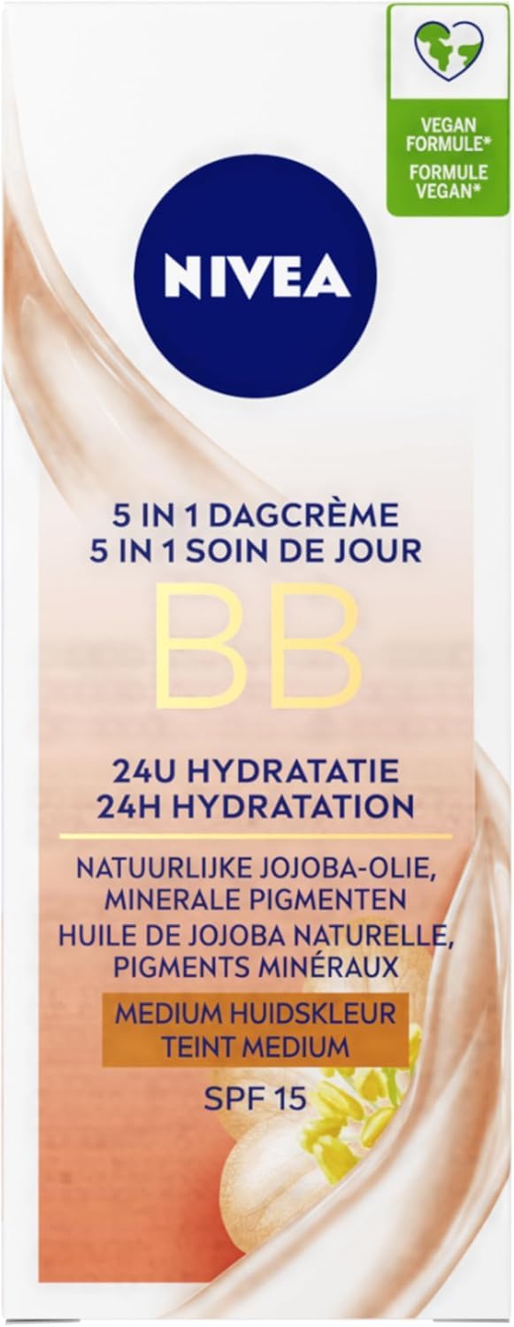 NIVEA BB Cream SPF 15 Medium Shade – For daily hydrated and protected skin NIVEA BB Cream evens out and brightens your complexion while providing effective and rapid hydration. This formula, enriched with organic jojoba oil, minerals, and pro-vitamin B5, corrects imperfections and signs of fatigue, as well as dark circles, blemishes, redness, and fine lines. Your pores are tightened and your skin texture refined. NIVEA's lightweight day cream is dermatologically tested and ideal for all skin types. Its SPF 15 formula provides protection against the sun and other external aggressors that cause premature skin aging. Apply this cream to your cleansed face using light circular motions. Avoid contact with the eyes. For optimal results, use in conjunction with other products from the NIVEA Essentials range. The benefits of this cream: Suitable for all skin types Hydrates, brightens, and evens skin tone Enriched with organic jojoba oil, minerals, and pro-vitamin B5 Corrects all skin imperfections SPF 15 protects against external aggressors INGREDIENTS Aqua, Glycerin, CI 77891, Cetearyl Alcohol, Ethylhexyl Salicylate, Methylpropanediol, Talc, C12-15 Alkyl Benzoate, Cocoglycerides, Butyrospermum Parkii Butter, Hydrogenated Coco-Glycerides, Palmitic Acid, Stearic Acid, Bis-ethylhexyloxyphenol Methoxyphenyl Triazine, Distarch Phosphate, Glyceryl Stearate, Isopropyl Palmitate, Simmondsia Chinensis Seed Oil, Myristic Acid, Arachidic Acid, Oleic Acid, Triisostearin, Ethylhexylglycerin Hydroxyacetophenone, Xanthan Gum, Phenylbene, Zimidazole Sulfonic Acid, Sodium Hydroxide, Phenoxyethanol, Fragrance, CI 77492, CI 77491, CI 77499 SAFETY WARNING For external use only. Avoid contact with eyes. See morePackaging – NIVEA BB Cream SPF 15 Medium Shade, for all skin types, NIVEA unifying face cream 1 x 50 ml, item number: 82334. Beauty tips – Apply this light face cream to your cleansed face using light circular motions. Avoid contact with eyes. UV protection – Its SPF 15 protects you from external aggressors, which are one of the main causes of premature skin aging. Special formula – Enriched with organic jojoba oil, minerals, and pro-vitamin B5, this day cream corrects everything: imperfections, signs of fatigue, dark circles, etc. Moisturizing care – This moisturizing cream with an SPF 15 formula hydrates, brightens, evens out, and protects your skin. It is ideal for all skin types.NIVEA BB Crème FPS 15 Teinte Medium (1 x 50ml), Crème hydratante visage à l'huile de Jojoba BIO, Soin de jour FPS 15 pour unifier le teint et estomper les imperfections, hydratation 24hDESCRIPTION DU PRODUIT DESCRIPTION DU PRODUIT NIVEA BB Crème FPS 15 Teinte Medium – Pour une peau hydratée et protégée au quotidien La BB Crème NIVEA unifie et illumine votre peau tout en l'hydratant efficacement et rapidement. Cette formule enrichie en Jojoba Bio, minéraux, et Pro-vitamine B5 corrige les imperfections et les signes de fatigue mais également les cernes, taches, rougeurs et ridules. Vos pores sont resserrés et votre grain de peau affiné. Le Soin de jour de NIVEA à la texture légère est testé sous contrôle dermatologique, il est idéal pour tous les types de peaux. Sa formule avec FPS 15 apporte une protection contre le soleil et les autres agressions extérieures qui sont responsables du vieillissement prématuré de la peau. Appliquez cette crème sur votre visage préalablement nettoyé en effectuant de légers massages circulaires. Évitez tout contact avec les yeux. Pour un résultat optimal, utilisez en complément le reste de la gamme NIVEA Essentials. Les bénéfices de cette crème : Convient à tous les types de peaux Hydrate illumine et unifie la peau Enrichie en Jojoba Bio, minéraux, et Pro-vitamine B5 Corrige tous les défauts de la peau FPS 15 protège des agressions extérieures INGRÉDIENTS Aqua, Glycerin, CI 77891, Cetearyl Alcohol, Ethylhexyl Salicylate, Methylpropanediol, Talc, C12-15 Alkyl Benzoate, Cocoglycérides, Butyrospermum Parkii Butter, Hydrogenated Coco-Glycérides, Palmitic Acid, Stearic Acid, Bis-éthyl hexyloxyphénol Methoxyphényl Triazine, Distarch Phosphate, Glyceryl Stearate, Isopropyl Palmitate, Simmondsia Chinensis Seed Oil, Myristic Acid, Arachidic Acid, Oleic Acid, Triisostearin, Ethylhexylglycérine, Hydroxyacétophénone, Xanthan Gum, Phenylbene zimidazole Sulfonic Acid, Sodium Hydroxyde, Phenoxyethanol, Parfum, CI 77492, CI 77491, CI 77499 AVERTISSEMENT DE SÉCURITÉ Alleen voor extern gebruik. Vermijd contact met de ogen. Voir plusEmballage – NIVEA BB Crème FPS 15 Teinte Medium, pour tous les types de peaux, crème visage unifiant NIVEA 1 x 50 ml, numéro d'article : 82334. Conseils beauté – Appliquez cette crème visage légère sur votre visage nettoyé en effectuant de légers mouvements circulaires. Évitez tout contact avec les yeux. Protection UV – Son indice FPS 15 vous protège des agressions extérieures qui sont l'une des causes principales du vieillissement prématuré de la peau. Formule spéciale – Enrichi en Huile de Jojoba Bio, Minéraux et Pro-vitamine B5, la crème de jour corrige tout : imperfections, signes de fatigue, cernes, etc. Soin hydratant – La crème hydratante à la formule avec indice FPS 15 hydrate, illumine, unifie et protège votre peau. Elle est idéale pour tous les types de peaux.