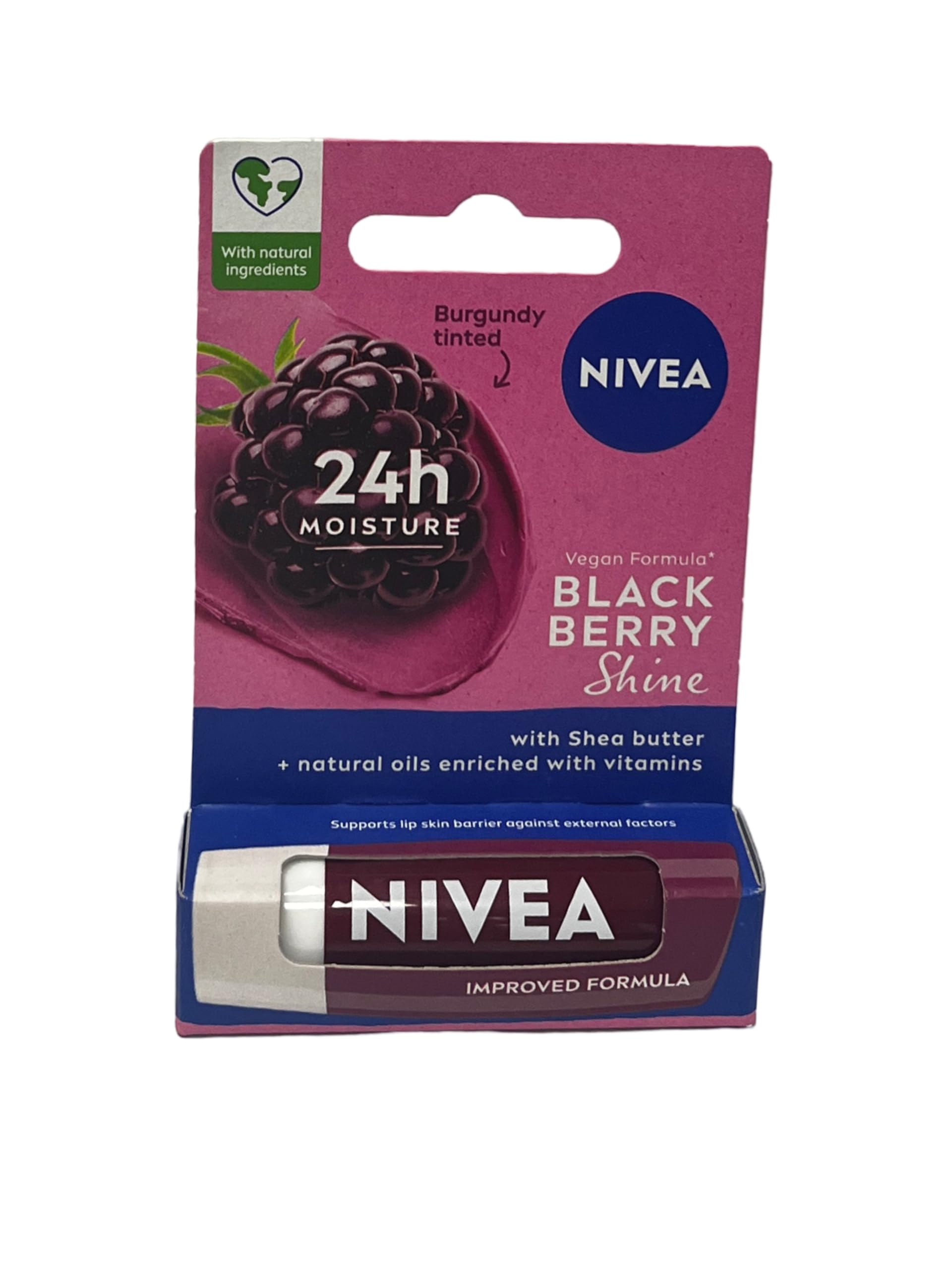 NIVEA's fruity Blackberry Shine lipstick will gently pamper your lips with an unusual blackberry scent, giving them a soft, glossy color while nourishing them at the same time! The unique lipstick formula with naturally derived ingredients and natural oils melts instantly into your lips for 24-hour hydration . It spreads so easily and evenly that you don't even need a mirror. For beautiful, glossy color and soft lips that are kissable all day long! The convenient fruit-shaped lipstick tube means you can always carry it with you. This product is suitable for daily lip care! Trust in NIVEA quality! Skin tolerance dermatologically confirmed. Clinically tested INGREDIENTS Octyldodecanol, Ricinus Communis Seed Oil, Cera Alba, Bis-Diglyceryl Polyacyladipate-2, Cocoglycerides, Butyrospermum Parkii Butter, Hydrogenated Castor Oil, Helianthus Annuus Seed Cera, Aroma, Persea Gratissima Oil, Simmondsia Chinensis Seed Oil, Tocopherol, Helianthus Annuus Seed Oil, Ascorbyl Palmitate, CI 15850, CI 77891, CI 77491, CI 42090 DIRECTIONS Dispense the appropriate amount of product onto the lips. SAFETY WARNING For external use only. See moreFor beautiful, glossy color and soft lips. Easily and evenly applied. It melts instantly into the lips for 24-hour hydration. Gives the lips a subtle sheen of color. Unusual blackberry scent.NIVEA Blackberry Shine Rouge à Lèvres Soin 4,8 gDESCRIPTION DU PRODUIT DESCRIPTION DU PRODUIT Le rouge à lèvres fruité de JeuBlackberry Shine chouchoutera doucement vos lèvres avec un parfum inhabituel de mûre, leur donnant une douce brillance de couleur et en les soignant en même temps! La formule unique de rouge à lèvres avec des ingrédients d'origine naturelle et des huiles naturelles se fond instantanément dans vos lèvres pour une hydratation de 24 heures . Il se propage si facilement et uniformément que vous n'avez même pas besoin d'un miroir. Pour une belle couleur brillante et des lèvres douces qui peuvent être embrassées toute la journée! La forme pratique du rouge à lèvres en bâton de fruits vous permet de toujours le porter avec vous. Le produit est adapté au soin quotidien de vos lèvres! Faites confiance à la qualité NIVEA! Tolérance cutanée confirmée dermatologiquement. testé cliniquement INGRÉDIENTS Octyldodécanol, Ricinus Communis Seed Oil, Cera Alba, Bis-Diglycéryl Polyacyladipate-2, Cocoglycérides, Butyrospermum Parkii Butter, Hydrogénée Castor Oil, Helianthus Annuus Seed Cera, Aroma, Persea Gratissima Oil, Simmondsia Chinensis Seed Oil, Tococol pherol, Helianthol hus Annuus Seed Oil, Ascorbyl Palmitate, CI 15850, CI 77891, CI 77491, CI 42090 MODE D'EMPLOI Distribuez la bonne quantité de produit sur les lèvres AVERTISSEMENT DE SÉCURITÉ Pour usage externe uniquement. Voir plusPour une belle couleur brillante et des lèvres douces. Facilement et uniformément réparti. Il se fond instantanément dans les lèvres pour une hydratation de 24 heures. Donne à la bouche une légère brillance de couleur. Odeur inhabituelle de mûre.