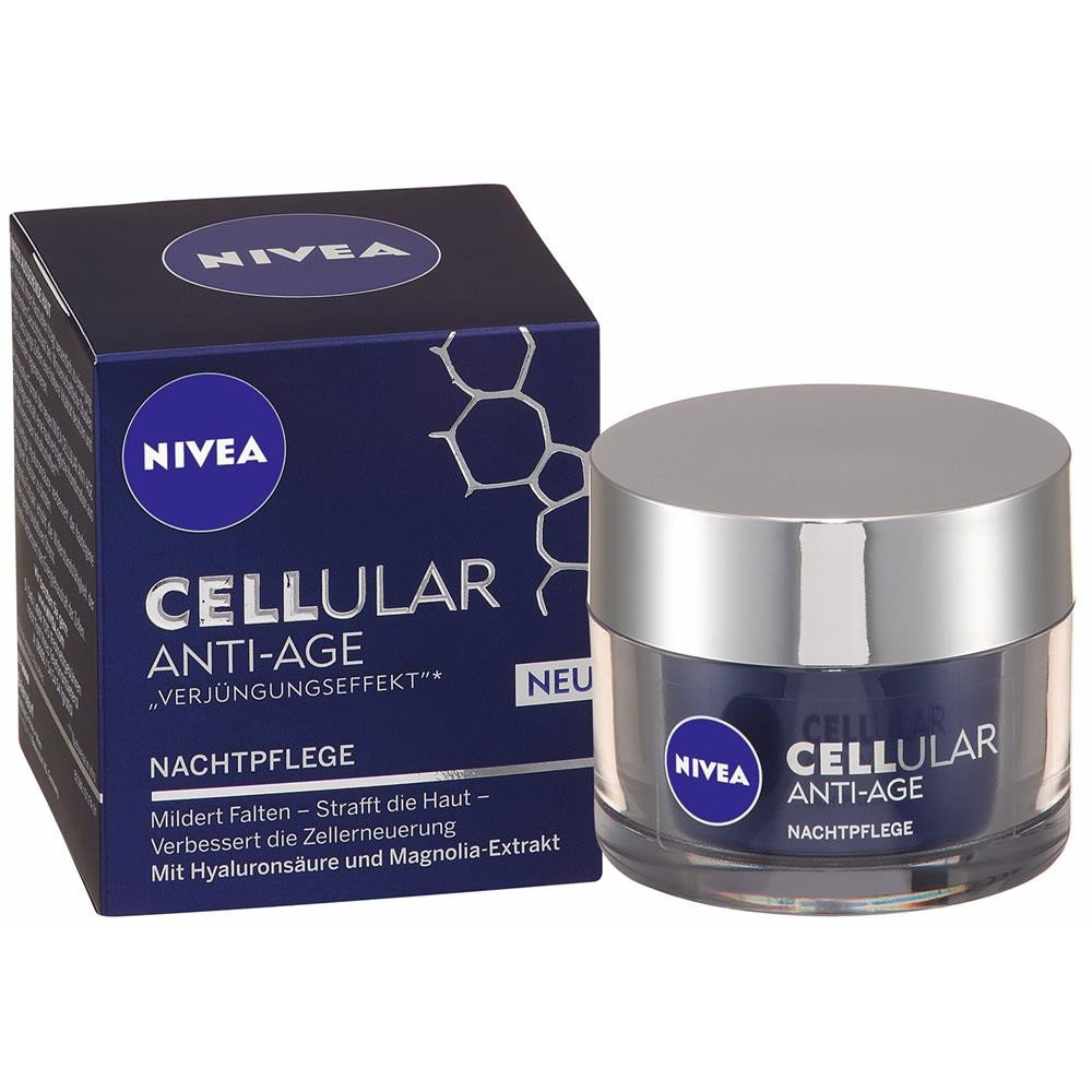NIVEA CELLULAR ANTI-AGE RE-ACTIVATES YOUR CELLS FOR A VISIBLY YOUNGER APPEARANCE, THE NEW ANTI-AGING SERIES FROM NIVEA Works deep within the cells With input from over 8,000 NIVEA users, we developed NIVEA CELLULAR ANTI-AGE to best meet the needs and desires of women. A skincare range including four new anti-aging products: the day and night cream is complemented by a special eye cream and an intensive serum. The combination of these four products intensely hydrates your skin, and their formula contains cell-activating ingredients such as hyaluronic acid, magnolia extract, and creatine. proven in scientific studies using cell culture, Beiersdorf AG NIVEA CELLULAR ANTI-AGE This rich treatment promotes the skin's natural regeneration overnight. With regular use, wrinkles are diminished, skin firmness is improved, and natural cell renewal is stimulated. The nourishing formula is gentle on the skin, absorbs quickly, and leaves an irresistible, long-lasting feeling. INTENSIVE CELLULAR ANTI-AGING SERUM This concentrated intensive serum instantly refines skin texture. Signs of fatigue are reduced, and skin feels silky and rejuvenated. Applied before your day and night creams, this anti-aging serum gives your skin an extra dose of care and hydration. NIVEA CELLULAR ANTI-AGE RE-ACTIVATES YOUR CELLS FOR A VISIBLY YOUNGER APPEARANCE, THE NEW ANTI-AGING SERIES FROM NIVEA Works deep within the cells With input from over 8,000 NIVEA users, we developed NIVEA CELLULAR ANTI-AGE to best meet the needs and desires of women. A skincare range including four new anti-aging products: the day and night cream is complemented by a special eye cream and an intensive serum. The combination of these four products intensely hydrates your skin, and their formula contains cell-activating ingredients such as hyaluronic acid, magnolia extract, and creatine. proven in scientific studies using cell culture, Beiersdorf AG NIVEA CELLULAR ANTI-AGE This rich treatment promotes the skin's natural regeneration overnight. With regular use, wrinkles are diminished, skin firmness is improved, and natural cell renewal is stimulated. The nourishing formula is gentle on the skin, absorbs quickly, and leaves an irresistible, long-lasting feeling. INTENSIVE CELLULAR ANTI-AGING SERUM This concentrated intensive serum instantly refines skin texture. Signs of fatigue are reduced, and skin feels silky and rejuvenated. Applied before your day and night creams, this anti-aging serum gives your skin an extra dose of care and hydration.Nivea Cellular Anti-Age Soin de Nuit 50 mlDESCRIPTION DU PRODUIT NIVEA CELLULAR ANTI-AGE RE-ACTIVE VOS CELLULES POUR UN APPAREIL VISIBLE PLUS JEUNE, LA NOUVELLE SERIE ANTIAGE DE NIVEA Agit en profondeur dans les cellules Avec plus de 8000 utilisatrices NIVEA nous avons développé NIVEA CELLULAR ANTI-AGE pour répondre au mieux aux besoins et aux désirs des femmes. Une gamme de soins comprenant quatre nouveaux produits anti-âge : la crème de jour et de nuit est complétée par un soin spécial des yeux et un sérum intensif. La combinaison des quatre produits hydrate intensément votre peau et leur formule contient des ingrédients activants cellulaires tels que l'acide hyaluronique, l'extrait de magnolia et la créatine. prouvé dans des études scientifiques en culture cellulaire, Beiersdorf AG NIVEA CELLULAIRE ANTI-ÂGE Le soin riche favorise la régénération naturelle de la peau pendant la nuit. Avec une utilisation régulière, les rides sont atténuées, la fermeté de la peau est améliorée et le renouvellement cellulaire naturel est stimulé. La formule nourrissante est douce pour la peau, pénètre rapidement et laisse une sensation irrésistible sur la peau qui dure longtemps. SÉRUM INTENSIF CELLULAIRE ANTI-ÂGE Le sérum intensif concentré affine instantanément le grain de peau. Les traces de fatigue sont réduites, la peau est soyeuse et rajeunie. Appliqué avant les soins de jour et de nuit, ce sérum anti-âge donne à la peau une dose supplémentaire de soin et d'hydratation.Il a été prouvé qu'il atténue les rides et raffermit votre peau.