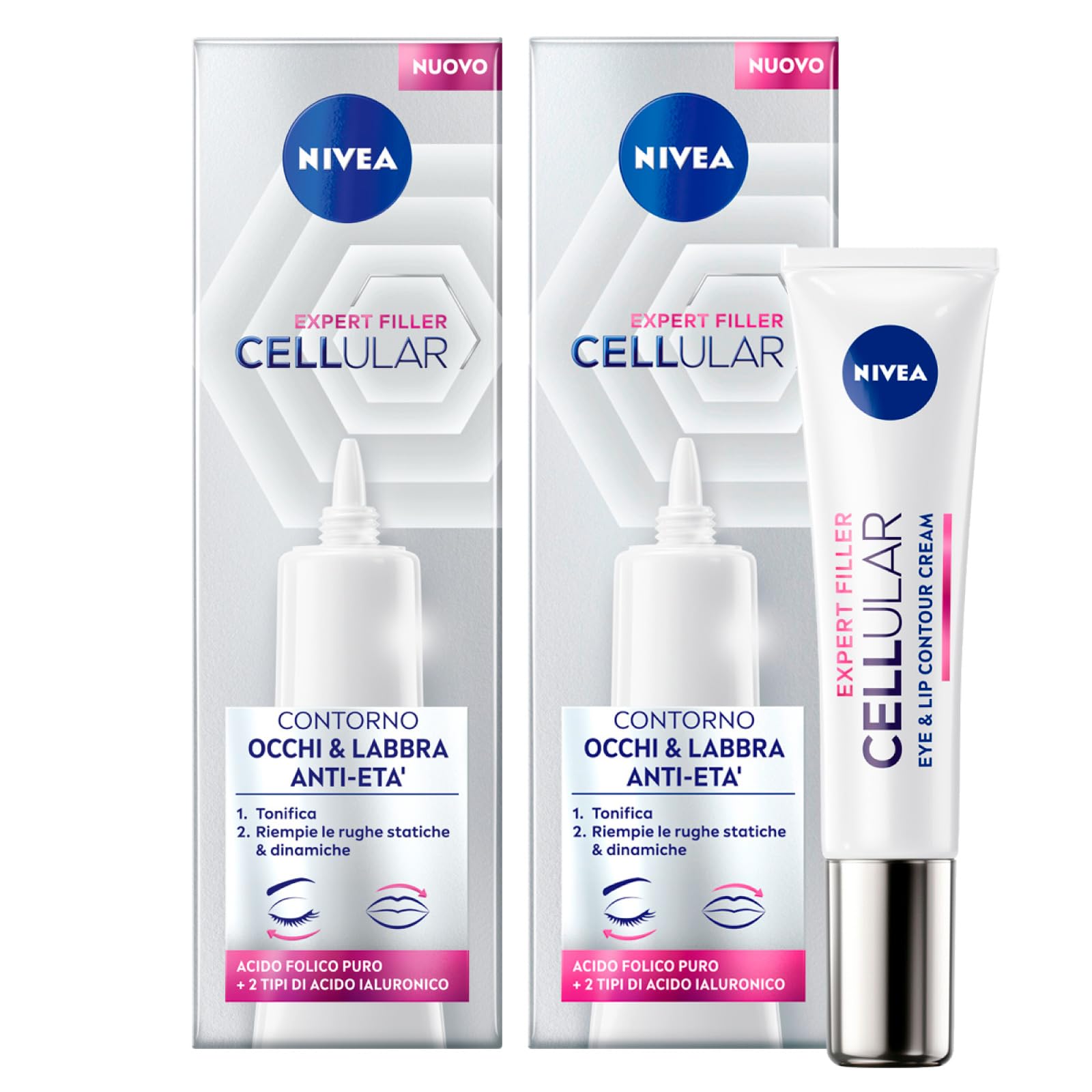 NIVEA HYALURON Cellular Filler Extra Firming Eye Cream is an eye cream that fills wrinkles and fine lines, improving skin tone. Its formula, containing a combination of hyaluronic acid and a collagen booster, stimulates skin cells and improves cell renewal. This anti-aging eye cream fills wrinkles and firms the skin, thanks to intense hydration: for a fresh and revitalized look. Apply the anti-wrinkle eye cream by gently patting it onto clean, residue-free skin. Product Benefits: Cell-renewing formula, fills wrinkles and fine lines around the eyes, improves tone, accelerates the cell renewal process, firms the delicate skin around the eyes, intensely hydrates, skin appears instantly more supple. For a fresh and radiant look. Tested on skin cellsApply the anti-wrinkle eye cream by gently patting it onto clean, residue-free skin. This firming eye cream intensely moisturizes, leaving skin looking more rested and giving a fresh, radiant appearance. This anti-wrinkle eye cream visibly reduces and fills wrinkles and fine lines, improving facial skin tone. The eye cream contains a combination of hyaluronic acid and a collagen booster that stimulates and renews skin cells. The kit contains: two 15ml bottles of Nivea Hyaluron Cellular Filler eye cream.Nivea Cellular Expert Filler Contour des yeux et des lèvres anti-âge avec acide folique pur et acide hyaluronique - 2 flacons de 15 mlDESCRIPTION DU PRODUIT NIVEA HYALURON Cellular Filler contour des yeux extra raffermissant est une crème pour les yeux qui remplit les rides et les lignes fines, améliorant la tonicité de la peau. Sa formule, contenant une combinaison d'acide hyaluronique et de booster de collagène, stimule les cellules de la peau et améliore le renouvellement cellulaire. La crème anti-âge pour le contour des yeux remplit les rides et raffermit la peau, grâce à une hydratation intense : pour un regard frais et revitalisé. Appliquer la crème anti-rides pour contour des yeux en tapotant doucement sur la peau du visage correctement nettoyée et sans résidus. Avantages du produit : Formule renouvelatrice des cellules, remplit les rides et les lignes fines autour des yeux, améliore la tonicité, accélère le processus de renouvellement cellulaire, raffermit la peau délicate du contour des yeux, hydrate intensément, la peau apparaît immédiatement plus remariée. Pour un regard frais et radieux. Testé sur les cellules de la peauAppliquer la crème anti-rides pour contour des yeux en tapotant doucement sur la peau du visage correctement nettoyée et sans résidus. La crème raffermissante pour contour des yeux hydrate intensément, laissant la peau plus reposée et donnant un regard frais et éclatant. Cette crème anti-rides pour les yeux réduit et remplit visiblement les rides et les lignes fines, améliorant la tonicité de la peau du visage. La crème pour les yeux contient une combinaison d'acide hyaluronique et Booster de collagène qui stimule les cellules de la peau et les renouvelle. Le kit contient : 2 flacons de crème Nivea Hyaluron Cellular Filler contour des yeux de 15 ml chacun.