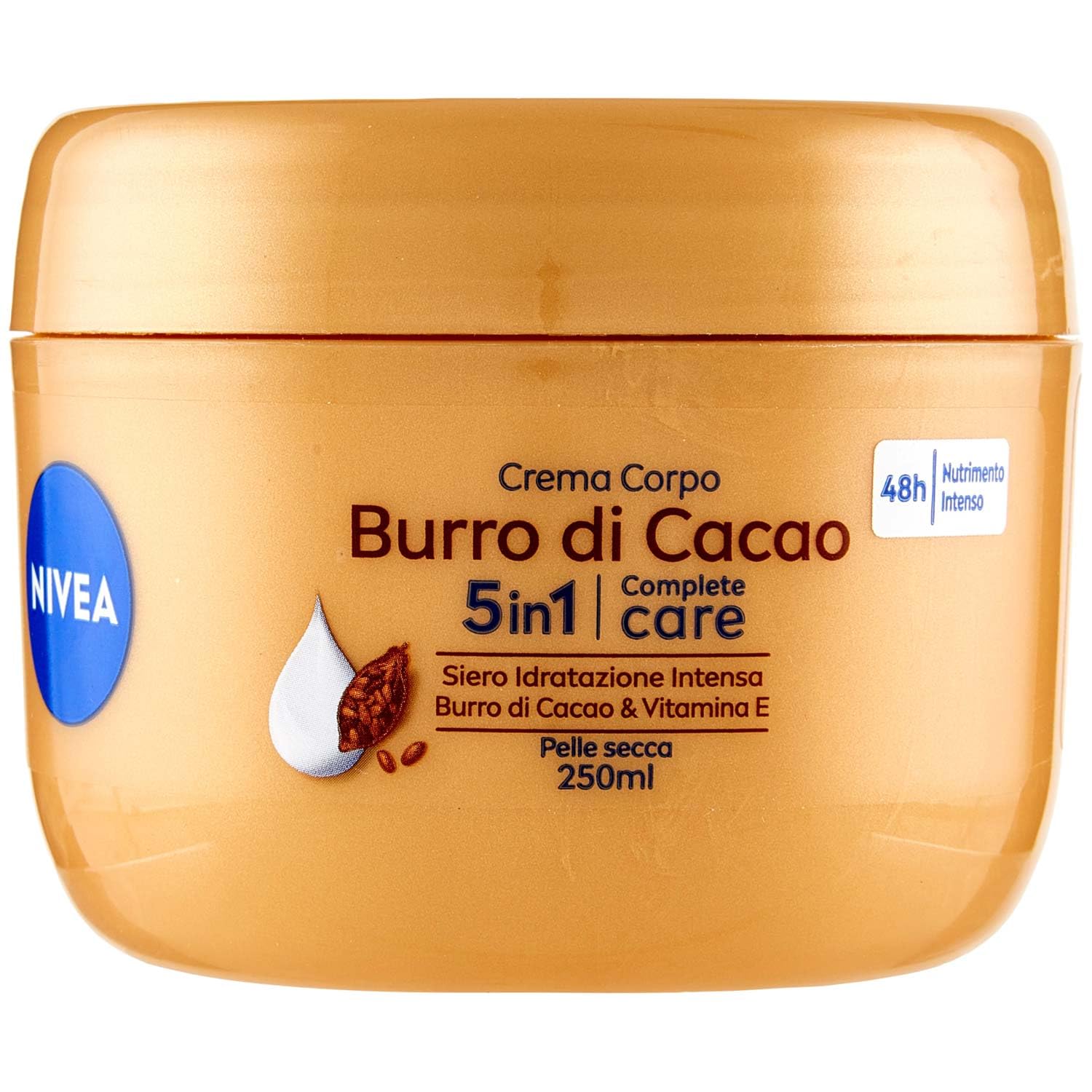 NIVEA Cocoa Butter Body Cream - Get ready for soft, moisturized, and radiant skin! NIVEA Cocoa Butter Body Cream is an extra-moisturizing body cream specially developed for dry skin. Enriched with intense hydration serum, cocoa butter, and vitamin E, this NIVEA cream's moisturizing and nourishing formula provides a natural radiance, leaving skin looking smooth and feeling wonderfully soft. The cream cares for your skin in 5 ways: it provides 48-hour intense hydration and the feeling of incredibly soft skin, protects against dehydration, deeply nourishes, and instantly gives your skin a healthy, radiant appearance. Treat yourself to a moment of pampering and apply the cream daily, massaging it in gently. Product Benefits: 48-hour hydration With intense hydration serum, cocoa butter, and vitamin E Soft skin feeling Visibly healthier-looking skin Protects against dehydration. Ideal for dry skin INGREDIENTS Aqua Glycerin Paraffinum Liquidum Cetearyl Alcohol Glyceryl Stearate Glyceryl Stearate SE Phenoxyethanol Butyrospermum Parkii Butter Dimethicone Carbomer Hydrogenated Coco-Glycerides Sodium Cetearyl Sulfate Cocos Nucifera Oil Sodium Hydroxide Ethylhexylglycerin Theobroma C Acao Seed Butter Tocopheryl Acetate Linalool Benzyl Alcohol Coumarin BHT Parfum SAFETY WARNING For external use only. Avoid contact with eyes. Keep away from direct flame or heat source. See moreContents of delivery - NIVEA Cocoa Butter Body Cream, Moisturizing Body Cream for Dry Skin with Intense Hydration Serum and Vitamin E, 1 tin of 250 ml. Item number: 88284. Take care of yourself - Enriched with moisturizing and nourishing ingredients, NIVEA women's body creams are the perfect opportunity to indulge in a moment of pure self-care. 5 Actions - NIVEA body cream provides 48-hour hydration, leaving skin incredibly soft, protecting against dehydration, deeply nourishing, and giving skin a healthy, radiant appearance. Active ingredients - Enriched with intense hydration serum, cocoa butter, and vitamin E, this women's body cream is ideal for all skin types, even the driest. Say goodbye to dry skin - NIVEA Cocoa Butter Body Cream leaves skin soft, moisturized, and radiant for 48 hours, from the very first application.NIVEA Crème Corps Beurre de Cacao 250ml, Crème hydratante pour le corps 48 heures, Crème hydratante pour la peau sèche enrichie en Sérum Hydratation Intense, Beurre de Cacao Vitamine EDESCRIPTION DU PRODUIT DESCRIPTION DU PRODUIT NIVEA Crème Corps Beurre de Cacao - Préparez-vous à une peau douce, hydratée et lumineuse ! NIVEA Crème Corps Beurre de Cacao est une crème corporelle extra hydratante développée spécialement pour la peau sèche. Enrichie en sérum hydratation intense, beurre de cacao et vitamine E, cette crème NIVEA à la formule hydratante et nourrissante apporte une luminosité naturelle, pour un aspect de peau lisse et une merveilleuse sensation de douceur. La crème prend soin de votre peau de 5 façons : apporte 48 heures d'hydratation intense et la sensation d'une peau incroyablement douce, protège contre la déshydratation, nourrit en profondeur et offre immédiatement un aspect sain et lumineux. Offrez-vous un moment de câlin tout pour vous et appliquez la crème au quotidien, en la massant doucement. Avantages du produit : 48h d'hydratation Avec sérum hydratation intense, beurre de cacao et vitamine E Sensation de peau douce. Peau visiblement plus saine Protège contre la déshydratation. Idéal pour les peaux sèches INGRÉDIENTS Aqua Glycerin Paraffinum Liquidum Cetearyl Alcohol Glyceryl Stearate Glyceryl Stearate SE Phenoxyethanol Butyrospermum Parkii Butter Dimethicone Carbomer Hydrogenated Coco-Glycerides Sodium Cetearyl Sulfate Cocos Nucifera Oil Sodium Hydroxide Ethylhexylglycerin Theobroma C Acao Seed Butter Tocopheryl Acétate Linalool Benzyl Alcohol Coumarin BHT Parfum AVERTISSEMENT DE SÉCURITÉ Usage extérieur uniquement. Évitez tout contact avec les yeux. Tenir à l'écart de la flamme nue directe ou de la source de chaleur. Voir plusContenu de la livraison - NIVEA Crème Corps Beurre de Cacao Crème Hydratante Corps Peau Sec avec Sérum Hydratation Intense et Vitamine E 1 Boîte de 250 ml Numéro d'article : 88284. Prenez soin de vous - Enrichies en ingrédients hydratants et nourrissants, les crèmes pour le corps de la femme NIVEA sont l'occasion idéale pour se faire plaisir d'un moment de pause tout pour soi. 5 Action - La crème corporelle NIVEA hydrate 48h apporte une incroyable douceur, protège contre la déshydratation, nourrit en profondeur et donne à la peau un aspect sain et lumineux. Ingrédients actifs - Enrichie en sérum hydratation intense, beurre de cacao et vitamine E, cette crème corps femme est idéale pour tous les types de peau, même la plus sèche. Adieu la peau sèche - La crème hydratante corps NIVEA Crème Corps Beurre de Cacao donne une peau douce, hydratée et lumineuse pendant 48 heures, dès la première application.