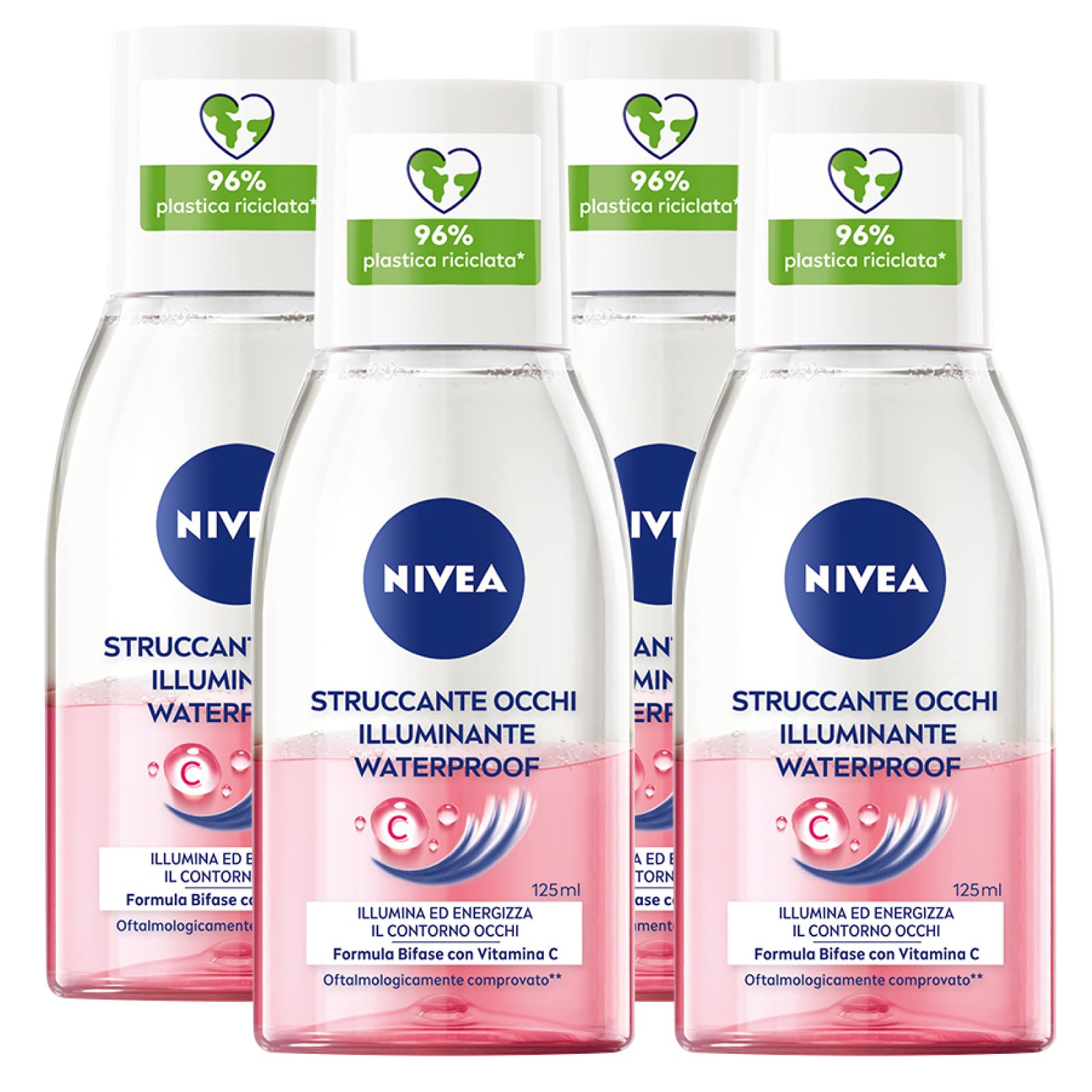 Nivea Démaquillant yeux éclaircissant pour maquillage imperméable à l'action nettoyant et énergisant formule végétalienne biphasée avec vitamine C pour contour des yeux et peaux sensibles – 4 flacons de 125 ml 4 x Démaquillants yeux éclairant étanche biphasé