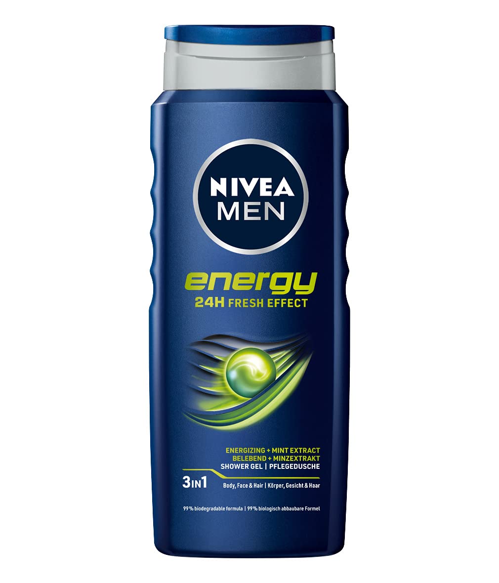 Contents Details – NIVEA Men Energy Shower Gel 500ml, revitalizing cleanser with refreshing mint extract 80786. 24-hour freshness feeling – This men's shower gel provides skin with 24-hour cleansing, care, and a feeling of freshness. Skin tolerance dermatologically tested. Skin and environment – This shower gel is 100 climate-neutral, with a 99 biodegradable formula free of microplastics. Mint extract – With invigorating mint extract and its fresh, distinctive fragrance, this shower gel gives skin a long-lasting feeling of freshness. Energy shower gel – NIVEA Men Energy shower gel provides optimal refreshment and skin care. It delivers energy and the feeling of intense care.