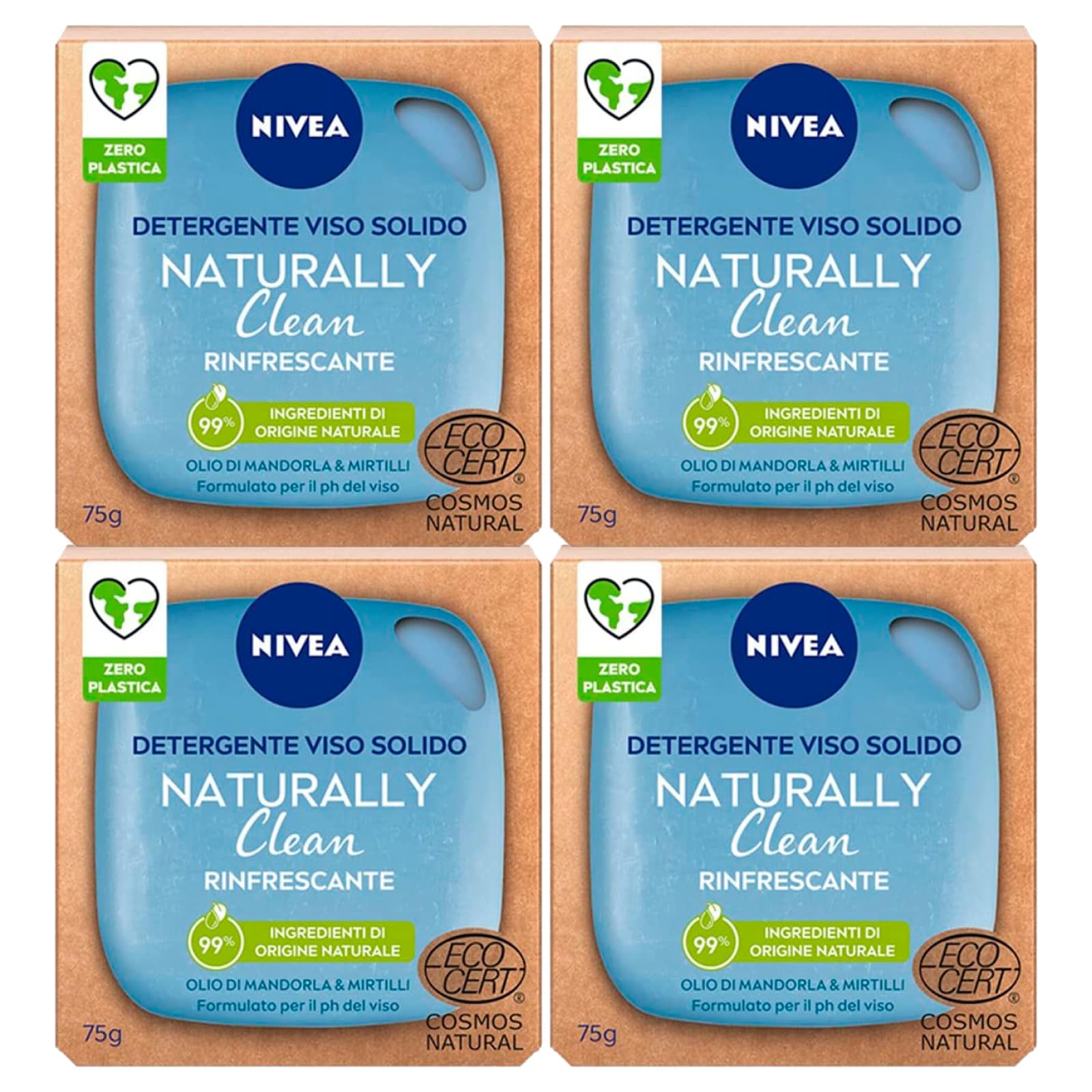 Nivea Naturally Clean Refreshing Solid Facial Cleanser is a completely plastic-free product with 99 naturally derived ingredients. Its formula, enriched with almond and blueberry oil, is 100 vegan and respects the skin's pH, leaving it soft and purified. For proper application, wet the solid facial cleanser with warm water and rub it until it forms an emulsion, then gently massage it onto the skin, keeping your eyes closed. Finally, rinse with warm water. Plastic-free. 99 naturally derived ingredients. Formulated for the skin's pH. Fully recyclable paper packaging. Vegan formula, contains no animal-derived ingredients. EcoCert Cosmos Natural certified.For proper use in your daily routine, wet the cleanser, rub until you create an emulsion, massage, and then rinse. This facial cleanser is enriched with almond and blueberry oils, two naturally derived ingredients with nourishing and antioxidant properties. The natural cleanser respects the skin's pH and is solid, so there's no need for a plastic bottle instead, it comes in recyclable paper packaging. The formula of this solid cleanser is 99 natural and 100 vegan, meaning it's free of ingredients of animal origin. The kit contains: 4 Nivea Naturally Clean Refreshing Solid Facial Cleansers, each 75g.Nivea Naturally Clean Nettoyant solide visage rafraîchissant avec huile d'amande et myrtilles formule végétalienne avec ingrédients 99 d'origine naturelle – 4 savons de 75 gDESCRIPTION DU PRODUIT Nivea Naturally Clean Nettoyant visage solide rafraîchissant est un produit entièrement sans plastique et avec 99 d'ingrédients d'origine naturelle. Sa formule enrichie en huile d'amande et de myrtilles est 100 végétalien et respecte le pH du visage, pour une peau douce et purifiée. Pour une application correcte, mouillez le nettoyant visage solide avec de l'eau chaude et frottez-le jusqu'à obtenir une émulsion, puis massez doucement sur la peau, en gardant les yeux fermés. Enfin, rincer à l'eau tiède. Sans plastique. 99 d'ingrédients d'origine naturelle. Formulé pour le pH du visage. Emballage en papier entièrement recyclable. Formule végétalienne, ne contient pas d'ingrédients d'origine animale. Certifié EcoCert Cosmos Nautural.Pour une utilisation correcte dans la routine quotidienne, mouiller le nettoyant, frotter jusqu'à obtenir une émulsion, masser et enfin rincer. Le nettoyant pour visage est enrichi en huile d'amande et de myrtilles, deux ingrédients d'origine naturelle, à action nourrissante et antioxydante. Le nettoyant naturel respecte le pH de la peau et est solide, donc pas besoin d'un flacon en plastique, remplacé par un emballage en papier recyclable. La formule de ce nettoyant solide est à 99 naturel et 100 végétalien, c'est-à-dire exempt d'ingrédients d'origine et d'origine animale. Le kit contient : 4 savons Nivea Naturally Clean Nettoyant visage solide rafraîchissant de 75 g chacun.