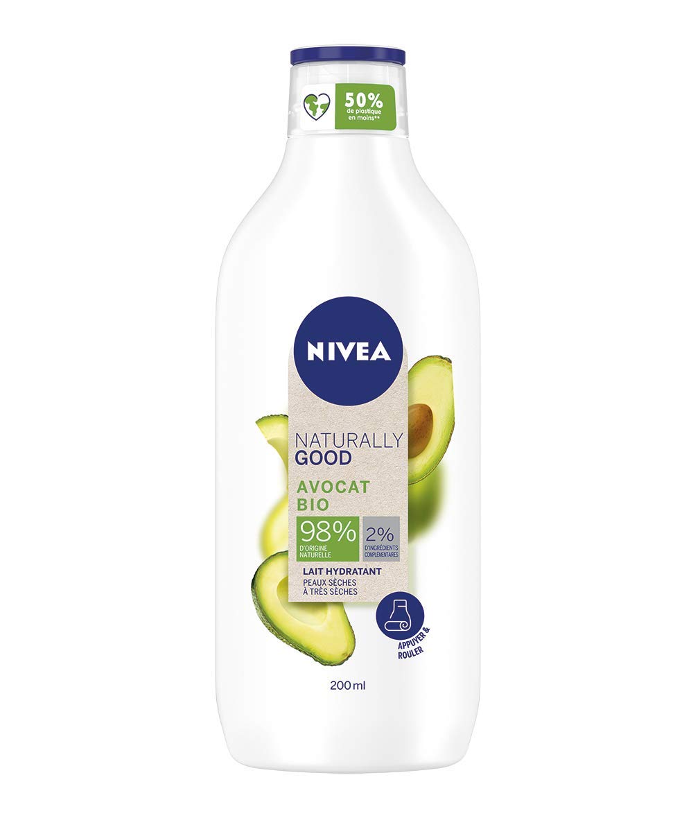 NIVEA NATURALLY GOOD Comforting Avocado Body Lotion - The natural moisturizer for dry to very dry skin Intensely moisturize your skin for 48 hours with this body lotion enriched with organic avocado, an ingredient with renowned nourishing properties. The 100 plant-based formula, 98 of which is of natural origin, contains only the essentials. Environmentally friendly, the clever NIVEA bottle is made of 100 recyclable flexible plastic: conveniently, it rolls and flattens like a toothpaste tube so you can use every last drop. This body lotion is the ideal ally for dry to very dry skin that needs particularly nourishing care to stay soft and comfortable all day long! Apply the body lotion to clean skin using light circular motions to ensure the product is fully absorbed. Avoid contact with eyes. The benefits of this body care product: Formula enriched with nourishing organic avocado 48-hour intense hydration for soft, comfortable skin Vegan formula with 98 naturally derived ingredients Eco-friendly smart bottle For dry to very dry skin Quantity: 1 x 200 mlPackaging – NIVEA NATURALLY GOOD Comforting Avocado Body Lotion, plant-based moisturizing cream, nourishing body care for dry to very dry skin, 1 x 200 ml, item number: 83353. Beauty tips – Apply the body lotion daily to clean skin, massaging gently in circular motions until absorbed. Intense hydration – This moisturizing lotion leaves skin perfectly hydrated and nourished for 48 hours. The result: soft and comfortable skin. Eco-friendly packaging – The 100 recyclable plastic bottle rolls flat, allowing you to enjoy every last drop of this women's care product. Vegan formula – NIVEA products contain 98 naturally derived ingredients and are 100 vegan, including nourishing organic avocado.NIVEA NATURALLY GOOD Lait corporel réconfortant Avocat (1 x 200 ml), lait hydratant avec 98 d'ingrédients d'origine naturelle, soin corps pour peaux sèches à très sèchesDESCRIPTION DU PRODUIT NIVEA NATURALLY GOOD Lait corporel réconfortant Avocat - Le soin hydratant naturel pour les peaux sèches à très sèches Hydratez intensément votre peau pendant 48 heures avec ce soin corporel enrichi en Avocat Bio, un ingrédient aux vertus nourrissantes reconnues. La formule 100 végétale et à 98 d'origine naturelle de ce soin hydratant ne contient que l'essentiel. Respectueux de l'environnement, le flacon intelligent du soin NIVEA est constitué de plastique souple 100 recyclable : pratique, il se roule et s'aplatit comme un tube de dentifrice afin que vous puissiez utiliser jusqu'à la dernière goutte du produit. Ce lait corps est l'allié idéal des peaux sèches à très sèches qui nécessitent un soin particulièrement nourrissant afin d'être douces et confortables durant toute la journée ! Appliquez le lait pour le corps sur la peau propre en effectuant de légers massages circulaires afin de bien faire pénétrer le produit. Évitez le contact avec les yeux. Les bénéfices du soin corporel : Formule enrichie en Avocat Bio aux propriétés nourrissantes 48 H d'hydratation intense pour une peau douce et confortable Formule végane à 98 d'ingrédients d'origine naturelle Flacon intelligent respectueux de l'environnement Pour peaux sèches à très sèches Quantité : 1 x 200 mlEmballage – NIVEA NATURALLY GOOD Lait corporel réconfortant Avocat, crème hydratante à la formule végétale, soin corps nourrissant pour peaux sèches à très sèches, 1 x 200 ml, numéro d'article : 83353. Conseils beauté – Appliquez quotidiennement le lait corps sur la peau propre en effectuant de légers massages circulaires pour faire pénétrer le produit. Hydratation intense – Avec ce soin hydratant, la peau est parfaitement hydratée et nourrie durant 48 heures. Résultat : elle est douce et confortable. Packaging eco-friendly – Le flacon en plastique 100 recyclable se roule et s'aplatit pour vous permettre de profiter du soin femme jusqu'à la dernière goutte. Formule végane – Le soin NIVEA contient 98 d'ingrédients d'origine naturelle et 100 végans, dont de l'Avocat Bio aux vertus nourrissantes.