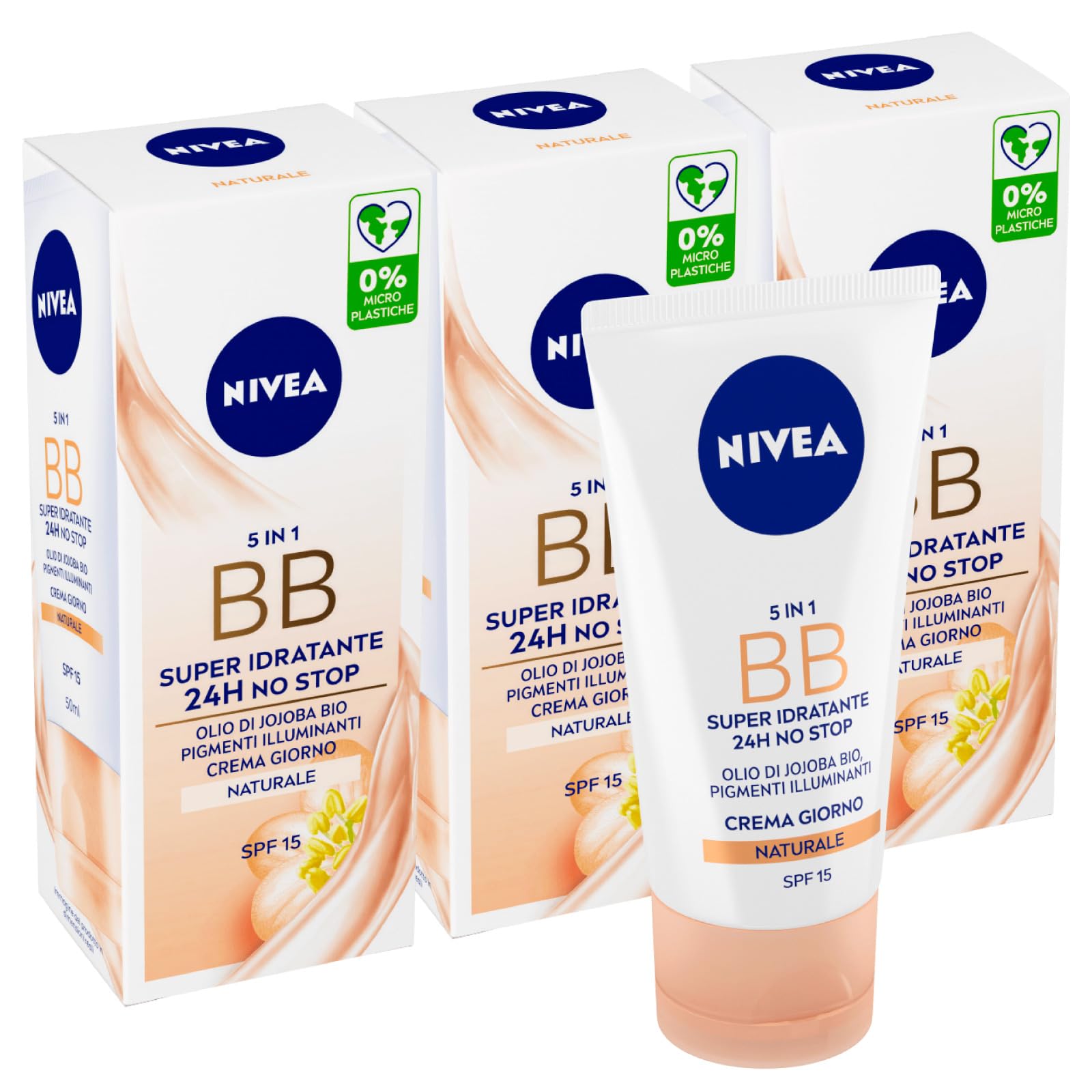 NIVEA ESSENTIALS BB Day Cream Super Moisturizing Natural Even Skin Tone is a nourishing, natural even skin tone cream enriched with color pigments. Its 5-in-1 formula, enriched with minerals, organic jojoba oil, provitamin B5, and light-reflecting pigments, moisturizes, brightens, evens, corrects, and protects the skin. The face cream covers imperfections such as signs of fatigue, dark circles, blemishes, and redness, brightens the complexion, and intensely hydrates the skin. Apply the cream to a clean face, gently massaging in circular motions and avoiding the eye area. Product Benefits: Evens skin tone Smooths and refines pores Covers imperfections Brightens the complexion Intensely moisturizes With SPF 15 sun protection Free of parabens and paraffins, for soft, radiant skin.This face cream evens out skin tone, smooths and refines pores, and provides SPF 15 sun protection. The nourishing and super-hydrating cream brightens the complexion, enhances the skin, and is suitable for all skin types. The pigmented tinted cream effectively covers imperfections such as blemishes, dark circles, spots, and redness. This day cream, enriched with minerals, organic jojoba oil, provitamin B5, and light-reflecting pigments, moisturizes, illuminates, smooths, corrects, and protects the face. The set contains: 3 bottles of NIVEA Essentials BB Cream, 50 ml each.NIVEA Nivea Essential BB Crème de jour Super Hydratante 24H No Stop SPF 15 uniforme visage hydratant avec huile de jojoba bio et minéraux - 3 flacons de 50 mlDESCRIPTION DU PRODUIT NIVEA ESSENTIALS BB Crème de jour super hydratante Uniforme naturelle est une crème nourrissante uniforme naturelle enrichie en pigments colorés. Sa formule 5 en 1, enrichie en minéraux, huile de jojoba bio, provitamine B5 et pigments lumineux, hydrate, illumine, uniforme, corrige et protège la peau. La crème pour le visage couvre les imperfections telles que les signes de fatigue, les cernes, les taches et les rougeurs, illumine le teint et hydrate intensément la peau. Appliquer la crème uniforme sur le visage propre, en massant doucement avec des mouvements circulaires et en évitant la zone du contour des yeux. Avantages du produit : uniformise la couleur Lisse et affine les pores Couvre les imperfections Illumine le visage et remonte le teint Hydrate intensément Avec protection solaire SPF15 Ne contient pas de parabènes et de paraffines, pour une peau douce et lumineuse.Cette crème visage lisse le teint, lisse et affine les pores tout en offrant un facteur de protection solaire SPF15. La crème nourrissante et super hydratante illumine le visage et souligne la peau et prend soin de tous les types de peau. La crème colorante pigmentée couvre efficacement les imperfections, telles que les signes, les cernes, les taches et les rougeurs. Crème visage jour avec minéraux, huile de jojoba biologique, provitamine B5 et pigments lumineux hydratent, illumine, lisse, corrige et protège le visage. Le lot contient : 3 bouteilles de NIVEA Essentials BB Cream de 50 ml chacune.