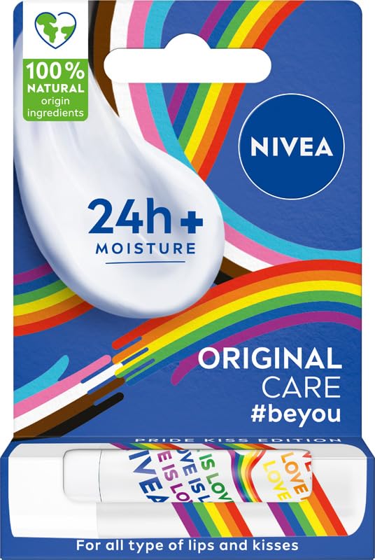 NIVEA Pride Kiss Edition lipstick leaves your lips feeling incredibly soft and protects them from dryness. The unique formula with natural oils, vitamins, and shea butter melts instantly into your lips for 24-hour hydration. It contains 100 naturally derived ingredients. The convenient lipstick bullet shape is perfect for carrying with you—in your pocket or purse. With NIVEA Pride Kiss Edition, we support diversity, equality, and inclusivity by standing against hate and intolerance. We celebrate every kiss and every mouth. Clinically tested. NIVEA stands for over 100 years of skincare expertise and carefully selected ingredients that meet the highest quality standards. Lipstick designs are chosen randomly for shipping. INGREDIENTS Helianthus Annuus Hybrid Oil, Cera Alba, Hydrogenated Rapeseed Oil, Butyrospermum Parkii Butter, Tocopherol, Ascorbyl Palmitate, Helianthus Annuus Seed Oil, Lecithin, Linalool, Citronellol, Citral, Aroma SAFETY WARNING For external use only See moreClinically tested. 100 naturally derived ingredients. Provides 24-hour hydration. With ethically sourced shea butter. With natural oils and vitamins.NIVEA Pride Kiss Edition Rouge à Lèvres Nourrissant Original Care 4,8 g Nourrir les lèvresDESCRIPTION DU PRODUIT DESCRIPTION DU PRODUIT Le rouge à lèvres NIVEA Pride Kiss Edition rend vos lèvres extrêmement douces et protège contre le dessèchement. La formule unique aux huiles naturelles, aux vitamines et au beurre de karité se fond instantanément dans vos lèvres pour une hydratation de 24 heures. Il contient 100 d'ingrédients d'origine naturelle. La forme pratique du bâton de rouge à lèvres est parfaite à transporter avec vous - dans votre poche ou votre sac à main. Avec NIVEA Pride Kiss Edition, nous soutenons la diversité, l'égalité et l'inclusivité en s'opposant à la haine et à l'intolérance. Nous célébrons chaque baiser et chaque bouche. Testé cliniquement. NIVEA est synonyme de plus de 100 ans d'expérience dans les soins de la peau et d'ingrédients soigneusement sélectionnés selon les normes de qualité les plus élevées. Les motifs de rouge à lèvres sont choisis au hasard lors de l'expédition. INGRÉDIENTS Helianthus Annuus Hybrid Oil, Cera Alba, Huile Rapeseed Hydrogenated, Butyrospermum Parkii Butter, Tocopherol, Ascorbyl Palmitate, Helianthus Annuus Seed Oil, Lecithin, Linalool, Citronellol, Citral, Aroma AVERTISSEMENT DE SÉCURITÉ Pour usage externe uniquement Voir plusTesté cliniquement. 100 d'ingrédients d'origine naturelle. Fournit une hydratation 24 heures. Avec du beurre de karité d'origine éthique. Avec des huiles naturelles et des vitamines.