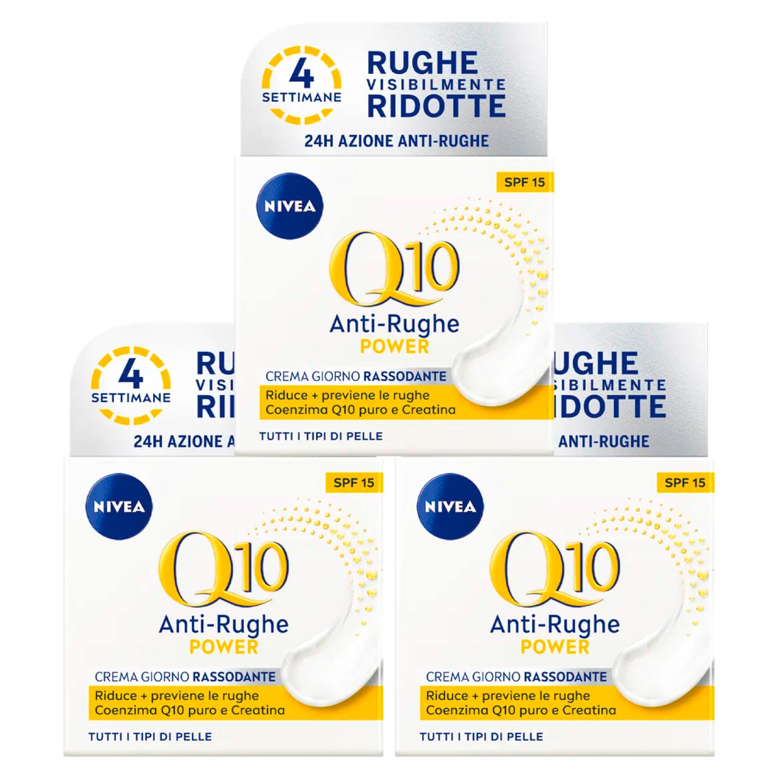 NIVEA Q10 POWER Firming Anti-Wrinkle Day Cream - Firming and revitalizing anti-wrinkle day cream. NIVEA Q10 Power Firming Anti-Wrinkle Day Cream is an anti-aging cream that nourishes and smooths the skin. Its formula is enriched with skin-identical coenzyme Q10, a powerful antioxidant, and creatine, an ingredient that stimulates the natural production of collagen . For 24 hours after application, skin will feel smooth and supple, while after one week, it will appear 21 firmer and wrinkles will be reduced . After four weeks, you will continue to see improvements . The day cream helps prevent the appearance of new wrinkles its skin compatibility is dermatologically proven. Product Benefits: Visibly reduced wrinkles in just 4 weeks 24-hour anti-wrinkle action with coenzyme Q10, a powerful antioxidant and natural anti-aging defense With creatine, which stimulates the skin's natural collagen production reduces and prevents wrinkles visibly firmer skin. In vitro. 1-week study with 47 women (2020) - 4-week study with 38 women.The creatine in this anti-aging cream stimulates the skin cells' natural collagen production for regenerated skin. NIVEA Q10 POWER face cream intensely moisturizes the skin for 24 hours, leaving it soft and smooth all day long. The formula with coenzyme Q10 and creatine in this face cream has a powerful antioxidant, firming, and smoothing action. This firming cream visibly reduces wrinkles after just 4 weeks and firms the skin after only 7 days of daily use. The kit contains: 3 x 50ml jars of Nivea Q10 Power Anti-Wrinkle Day Cream.Nivea Q10 Power Crème de jour anti-rides raffermissante SPF15 anti-âge 24 heures d'hydratation avec créatine et coenzyme Q10-3 pots de 50 mlDESCRIPTION DU PRODUIT NIVEA Q10 POWER Crème Jour Anti-Rides Raffermissante - Crème Anti-rides de jour raffermissante et revitalisante. NIVEA Q10 Power Crème de jour anti-rides raffermissante est une crème anti-âge qui nourrit et lisse la peau. Sa formule est enrichie en coenzyme Q10 identique à celui de la peau, un puissant antioxydant, et créatine, un ingrédient qui stimule la production naturelle de collagène . Pendant 24 heures après l'application, la peau sera lisse et lisse, tandis qu'après une semaine, elle apparaîtra plus raffermie de 21 et les rides seront réduites . Après quatre semaines, vous continuerez à assister à des améliorations . La crème de jour prévient l'apparition de nouvelles rides, sa compatibilité cutanée est prouvée dermatologiquement. Avantages du produit : Rides visiblement réduites dès 4 semaines 24h Action anti-rides avec coenzyme Q10, puissant antioxydant et naturel défense anti-âge avec créatine, qui stimule la production naturelle de collagène de la peau réduit et prévient les rides peau visiblement raffermie. In vitro. Étude de 1 semaine avec 47 femmes 2020 - Étude de 4 semaines avec 38 femmes.La créatine contenue dans la crème anti-âge stimule la production naturelle de collagène des cellules cutanées pour une peau régénérée. La crème pour visage NIVEA Q10 POWER hydrate intensément la peau pendant 24 heures, en la laissant douce et douce pendant toute la journée. La formule avec coenzyme Q10 et créatine de la lotion visage en crème a une puissante action antioxydante, raffermissante et lissante. Cette crème raffermissante réduit visiblement les rides après seulement 4 semaines et raffermit la peau dès 7 jours d'utilisation quotidienne. Cette crème raffermissante réduit visiblement les rides après seulement 4 semaines et raffermit la peau dès 7 jours d'utilisation quotidienne. Le kit contient : 3 bocaux de Nivea Q10 Power Crème jour anti-rides de 50 ml.