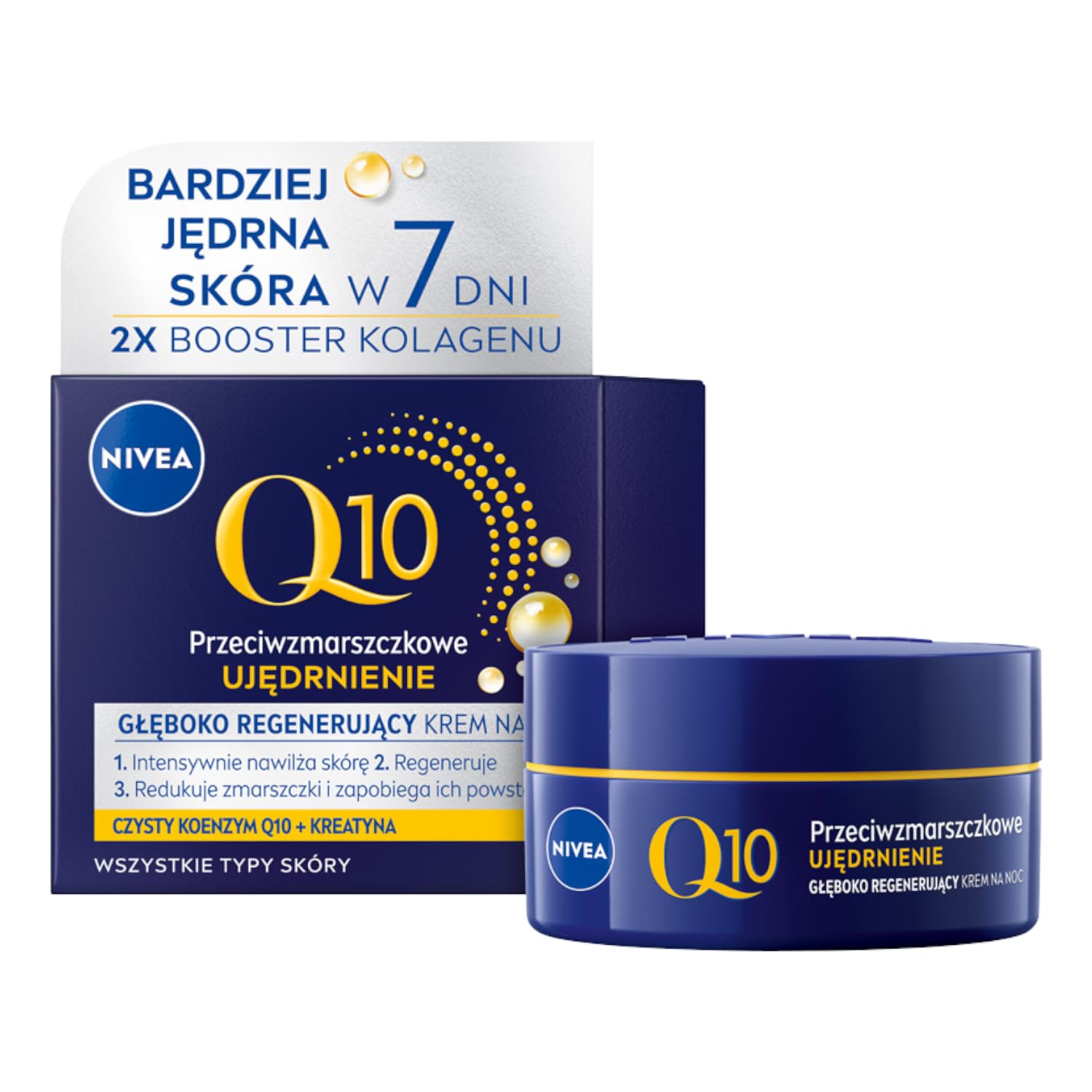 Coenzyme Q10 is found in every skin cell, giving it a boost of energy and protecting it by naturally combating the skin's aging process. With age, the amount of coenzyme Q10 in the skin decreases, making it more susceptible to the signs of aging. NIVEA Q10 POWER Anti-Wrinkle Firming Night Cream with natural coenzyme Q10 and creatine contains ingredients identical to the skin's own coenzyme Q10. The pure, natural quality of the coenzyme Q10, obtained through yeast fermentation, works in perfect harmony with your skin. In addition, the formula contains creatine, an organic acid that strengthens the skin's firming fibers , visibly reducing wrinkles, firming, and nourishing the skin. Furthermore, it regenerates the skin overnight when it is most receptive to the absorption of active ingredients. Tested in vitro INGREDIENTS Aqua, Glycerin, Ethylhexyl Cocoate, Methylpropanediol, Cetyl Alcohol, Hydrogenated Coco-Glycerides, Stearyl Alcohol, Butylene Glycol, Caprilic Capric Triglyceride, Butyrospermum Parkii Butter, GlyCeryl Stearate Citrate, Macadamia Integrifolia Seed Oil, Ubiinone, Creatine, 1 Methylhydantoin-2-Imide, Panthenol, Pantolactone, Lanolin Alcohol, Tricyl Stearate, Tricyl Trimel, Trimelyl Litate, Dipentaerythrityl Hexacaprate Hexacaprate, Ethylhexylglycerin, Carbomer, Trisodium EDTA, Citric Acid, Sodium Hydroxide, Phenoxide. ethanol, linalool, Benzyl Alcohol, Citronellol, Geraniol, Alpha. -Isomethyl Ionone, Benzyl Salicylate, Limonene, Fragrance DIRECTIONS Cleanse your face thoroughly. Apply the product to your complexion and massage gently in circular motions. Use every evening. SAFETY WARNING Protects the eye area. See moreFor a smoother, healthier complexion. Regenerates skin overnight when it's most receptive to active ingredients. Intensely nourished for 24 hours. Noticeably firmer skin in just 2 weeks. Visible wrinkle reduction in 4 weeks.NIVEA Q10 Power Crème hydratante anti-rides 50 mlDESCRIPTION DU PRODUIT DESCRIPTION DU PRODUIT La coenzyme Q10 se trouve dans chaque cellule de la peau qui lui donne un regain d'énergie et la protège en luttant naturellement contre le processus de vieillissement de la peau. Avec l'âge, la coenzyme Q10 diminue dans la peau et est donc plus exposée aux signes du vieillissement. NIVEA Q10 POWER Crème de nuit anti-rides raffermissement avec coenzyme Q10 naturel et créatine, contient des produits identiques tels que la coenzyme Q10 de la peau. La qualité pure et naturelle de la coenzyme Q10 obtenue par la fermentation de la levure agit en parfaite harmonie avec votre peau. En outre, la formule contient de la créatine, un acide organique qui renforce les fibres de raffermissement de la peau , ce qui réduit visiblement les rides, raffermit et nourrit la peau. En outre, il régénère la peau la nuit quand elle est la plus sensible à l'absorption des principes actifs. Testé in vitro INGRÉDIENTS Aqua, Glycerin, Ethylhexyl Cocoate, Methylpropanediol, Cetyl Alcohol, Hydrogenated Coco-Glycerides, Stearyl Alcohol, Butylene Glycol, Caprilic Capric Triglyceride, Butyrospermum Parkii Butter, GlyCeryl Stearate Citrate, Macadamia Integrifolia Seed Oil, Ubiinone, Créatine, 1 Methylhydantoïne-2-Imide, Panthénol, Pantolactone, Lanolin Alcohol, Tricyl Stearate, Tricyl Trimel, Trimelyl Litate, D ipentaerythrityl Hexacaprate Hexacaprate, Ethylhexylglycérine, Carbomer, Trisodium EDTA, Citric Acid, Sodium Hydroxide, Phenoxyde. éthanol, linalol, Benzyl Alcohol, Citronellol, Geraniol, Alpha. -Isomethyl Ionone, Benzyl Salicylate, Limonene, Parfum MODE D'EMPLOI Nettoyez votre peau du visage en profondeur. Appliquez le produit sur le teint et massez la peau avec des mouvements circulaires doux. À utiliser tous les jours le soir AVERTISSEMENT DE SÉCURITÉ Protège le contour des yeux. Voir plusPour un teint plus lisse et plus sain. Régénère la peau la nuit quand elle est la plus sensible à l'absorption des principes actifs. Peau intensément nourrie pendant 24 heures. Une peau sensiblement plus ferme dès 2 semaines. Réduction des rides visible en 4 semaines.