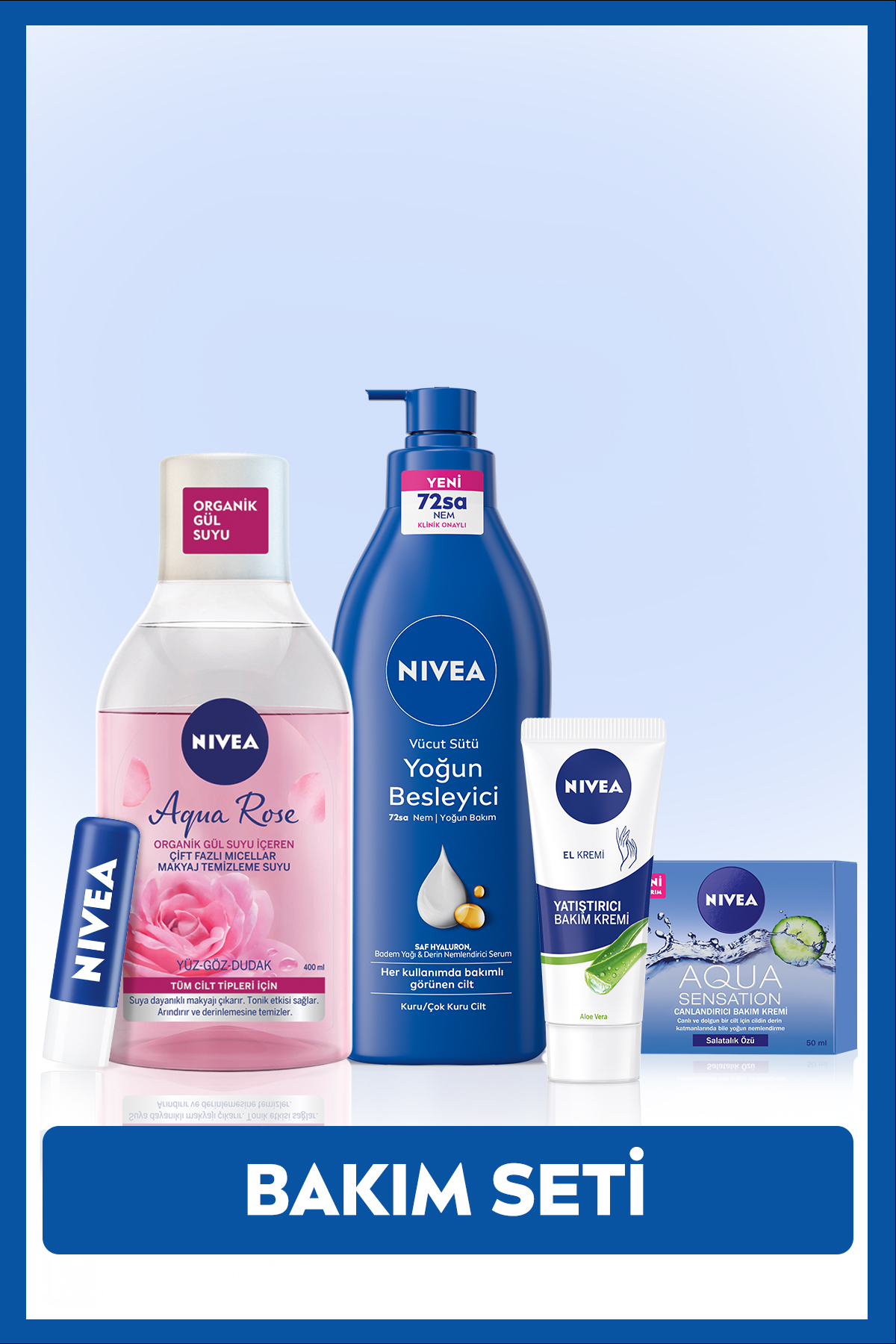 Besleyici Vücut Sütü 400ml, Makyaj Temizleme Suyu 400ml, El Kremi, Yüz Kremi ve Dudak Bakim Kremi
