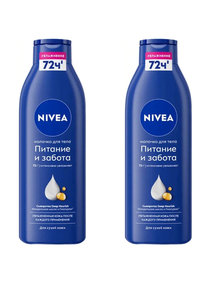 Nivea, молочко для тела Питательное, для очень сухой кожи, 2 шт по 250 мл. Вашей коже необходимо срочное увлажнение и уход? Попробуйте молочко для тела «Питание и забота» от NIVEA для сухой кожи. Молочко для тела «Питание и забота» с комплексом Deep Moisture (Глубокое Увлажнение), миндальным маслом и витамином Е для комплексного ухода 5в1: 48 часов интенсивного увлажнения, ощущение гладкости кожи, естественное сияние, ощущение мягкости кожи, приятный аромат. Используй ежедневно как лосьон для тела. Дерматологически протестировано.
