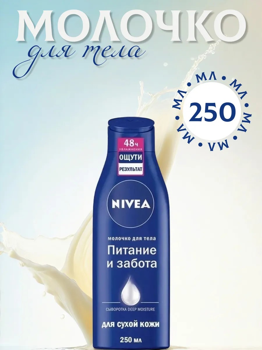 Попробуйте молочко для тела «Питание и забота» от NIVEA для сухой кожи. Молочко для тела «Питание и забота» с комплексом Deep Moisture (Глубокое Увлажнение), миндальным маслом и витамином Е для комплексного ухода 5в1: 48 часов интенсивного увлажнения, ощущение гладкости кожи, естественное сияние, ощущение мягкости кожи, приятный аромат. Используй ежедневно как лосьон для тела. Дерматологически протестировано. Применение: немного средства налить в ладони и втирать в очищенную сухую кожу круговыми массажными движениями, распределяя по всему телу. Не стоит использовать сразу большое количество, лучше добавлять продукт постепенно по мере необходимости. Наносите молочко ежедневно на все тело, уделяя особое внимание наиболее сухим участкам.