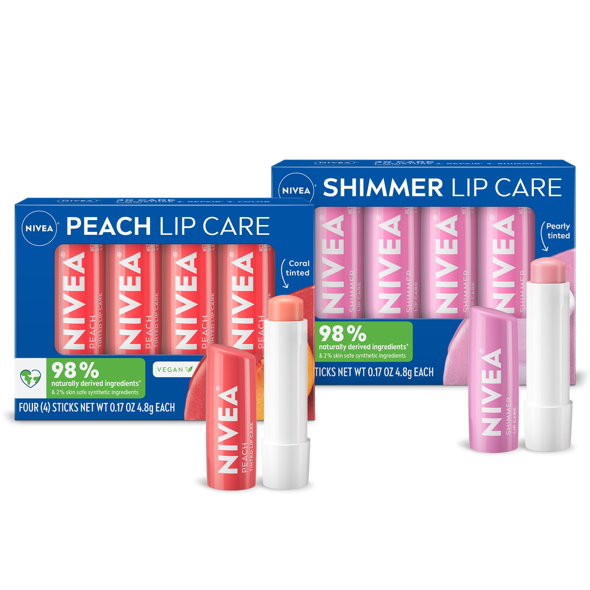 INCLUDES: One pack of four (4) 0.17 ounce sticks of NIVEA Shimmer Lip Care, and one pack of four (4) 0.17 ounce sticks of NIVEA Peach Lip Care, Tinted Lip Balm Set. DERMATOLOGICALLY-TESTED: NIVEA Lip Care products are dermatologically tested for skin compatibility, so you can feel confident in these lipstick beauty products and are made with 98 naturally derived ingredients(2) and formulated without preservatives, phthalates and silicones. DEEP HYDRATION: These moisturizing lip balms are instantly hydrating and protect from dryness with long-lasting moisture for soft lips with a nice lip color. NOURISHING INGREDIENTS: Both Shea Butter lip balms are enriched with Nourishing Oils and Vitamins C and E to help moisturize, repair and nourish dry lips NIVEA Peach is a vegan lip balm. BEAUTIFUL HYDRATION: Pale pink shimmer lip balm with sheer color enhances the natural beauty of your lips, and peach flavored lip balm with color leaves lips soft and smooth with a beautiful light coral lip tint.