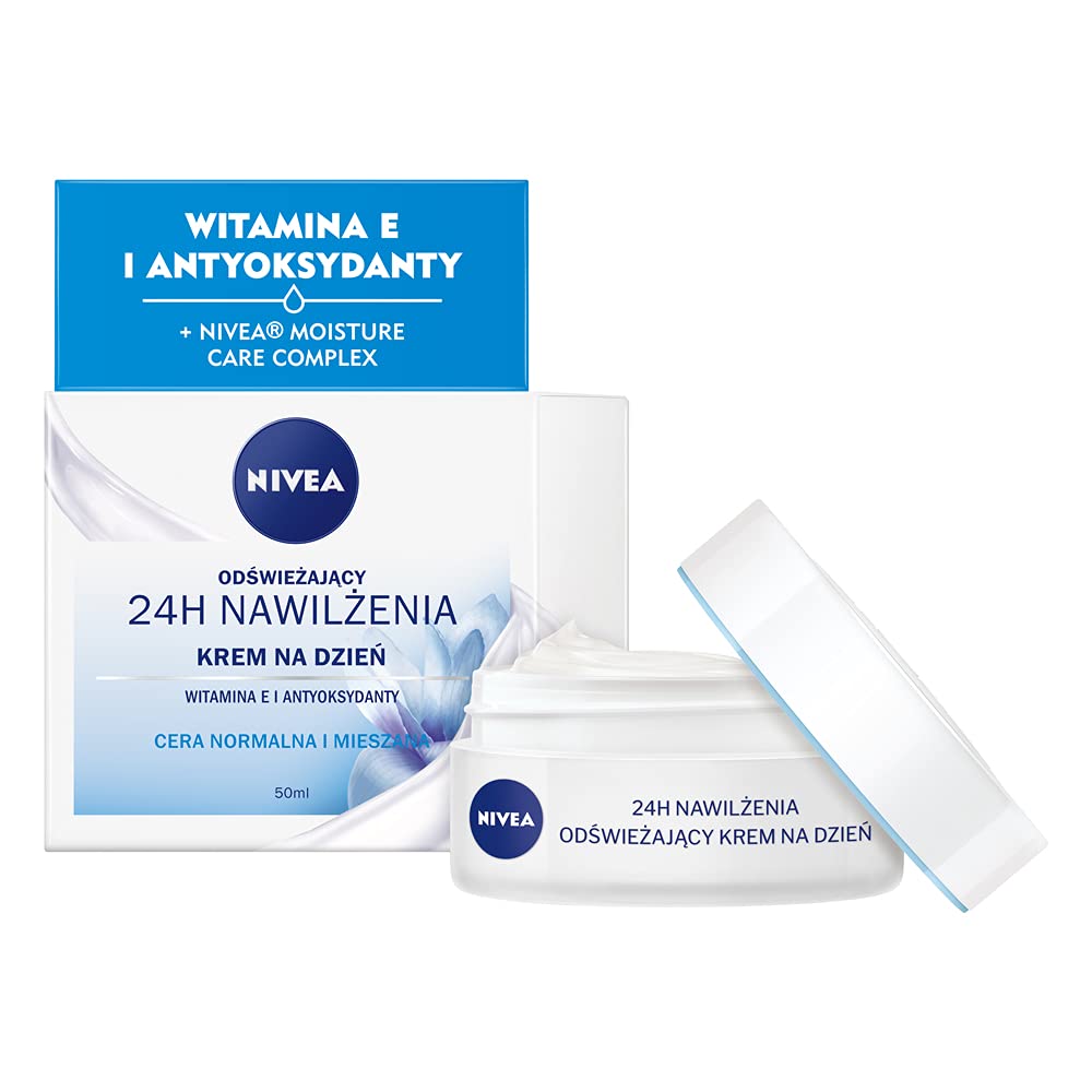 Nivea 24 hour moisturizing day cream contains a unique formula with vitamin E, antioxidants, lotus blossom extract and NIVEA Moisture Care Complex. It intensively hydrates the skin for up to 24 hours and restores its natural balance and hydration. Refreshes and replenishes the skin with abundant, fast-absorbing hydration. Protects the skin against negative effects of external factors and oxidative stress. Dermatologically confirmed skin tolerance. See and feel hydrated skin! Pamper your skin with this light, quickly absorbing and easy to apply cream. Enjoy a deeply hydrating, strengthened and refreshed complexion every day. That is why NIVEA develops products that support its own biology particularly effectively, so that your complexion remains full of life. They bring out the natural beauty of your skin so you look and feel great every day. Choose what your skin needs most now INGREDIENTS Aqua, Glycerin, Alcohol Denat. , Methylpropanediol, Cetearyl Alcohol, Ethylhexyl Salicylate, Ethylhexyl Stearate, Tapioca Starch, Dimethicone, Glyceryl Stearate Citrate, Caprylic Capric Triglyceride, Cetearyl Isononanoate, Myristyl Myristate, Octyldodecanol, Glucosylrutin, Isoquercitrin, Tocopheryl Acetate, Nelumbo Nucifera Flower Extract, Ethylhexylglycerin, Acrylates C10-30 Alkyl Acrylate Crosspolymer, Ammonium Acrylyldimethyl Taurate VP Copolymer, Butylmethoxydibenzoylmethane, Trisatum EDTA, Sodium Hydroxide, Phenoxyethanol, Limonium Linalool, Legs, Linalool, Zyl Alcohol, Citronellol, Geraniol, Alpha-Isomethyl Ionone, Benzyl Salicylate, BHT, Perfume SAFETY WARNING For outdoor use only. See moreSuitable for normal and combination complexions. Protects the skin against negative effects of external factors and oxidative stress. Refreshes and replenishes the skin with abundant, fast-absorbing hydration. Intensely moisturizes for up to 24 hours, restores the natural balance and hydration of the skin. Contains a formula with vitamin E, antioxidants and lotus flower extract.NIVEA NIVEA 24H Hydraterende verfrissende dagcrème normale en gemengde teint 50ml Nivea 24 uur vochtinbrengende dagcrème bevat een unieke formule met vitamine E, antioxidanten, lotusbloesemextract en NIVEA Moisture Care Complex. Het hydrateert de huid tot 24 uur intensief en herstelt de natuurlijke balans en hydratatie. Verfrist en vult de huid met een overvloedige, snel absorberende hydratatie. Beschermt de huid tegen negatieve effecten van externe factoren en oxidatieve stress. Dermatologisch bevestigde huidtolerantie. Zie en voel een gehydrateerde huid! Verwen je huid met deze lichte, snel absorberende en gemakkelijk aan te brengen crème. Geniet elke dag van een diep hydraterende, versterkte en verfrisse teint. Daarom ontwikkelt NIVEA producten die zijn eigen biologie bijzonder effectief ondersteunen, zodat je teint vol leven houdt. Ze brengen de natuurlijke schoonheid van je huid naar voren zodat je er elke dag geweldig uitziet en voelt. Kies wat je huid nu het meest nodig heeft INGREDIËNTEN Aqua, Glycerine, Alcohol Denat. , Methylpropanediol, Cetearyl Alcohol, Ethylhexyl Salicylaat, Ethylhexyl Stearaat, Tapiocazetmeel, Dimethicon, Glycerylstearaat Citraat, Capryl Capric Triglyceride, Cetearyl Isononanoate, Myristyl Myristaat, Octyldodecanol, Glucosylrutine, Isoquercitrin, Tocopheryl Acetaat, Nelumbo Nucifera Flower Extract, Ethylhexylglycerine, Acrylaten C10-30 Alkyl Acrylaat Crosspolymeer, Ammonium Acrylyldimethyltauraat VP Copolymeer, Butylmethoxydibenzoylmethaan, Trisatum EDTA, Natriumhydroxide, Fenoxyethanol, Limonium Linalool, Benen, Linalool, zyl Alcohol, Citronellol, Geraniol, Alpha-Isomethyl Ionon, Benzylsalicylate, BHT, Parfum VEILIGHEIDSWAARSCHUWING Alleen voor buitengebruik. Meer bekijkenGeschikt voor normale en gecombineerde teint. Beschermt de huid tegen negatieve effecten van externe factoren en oxidatieve stress. Verfrist en vult de huid met overvloedige, snel absorberende hydratatie. Intens hydrateert tot 24 uur, herstelt de natuurlijke balans en hydratatie van de huid. Bevat een formule met vitamine E, antioxidanten en lotusbloemextract.