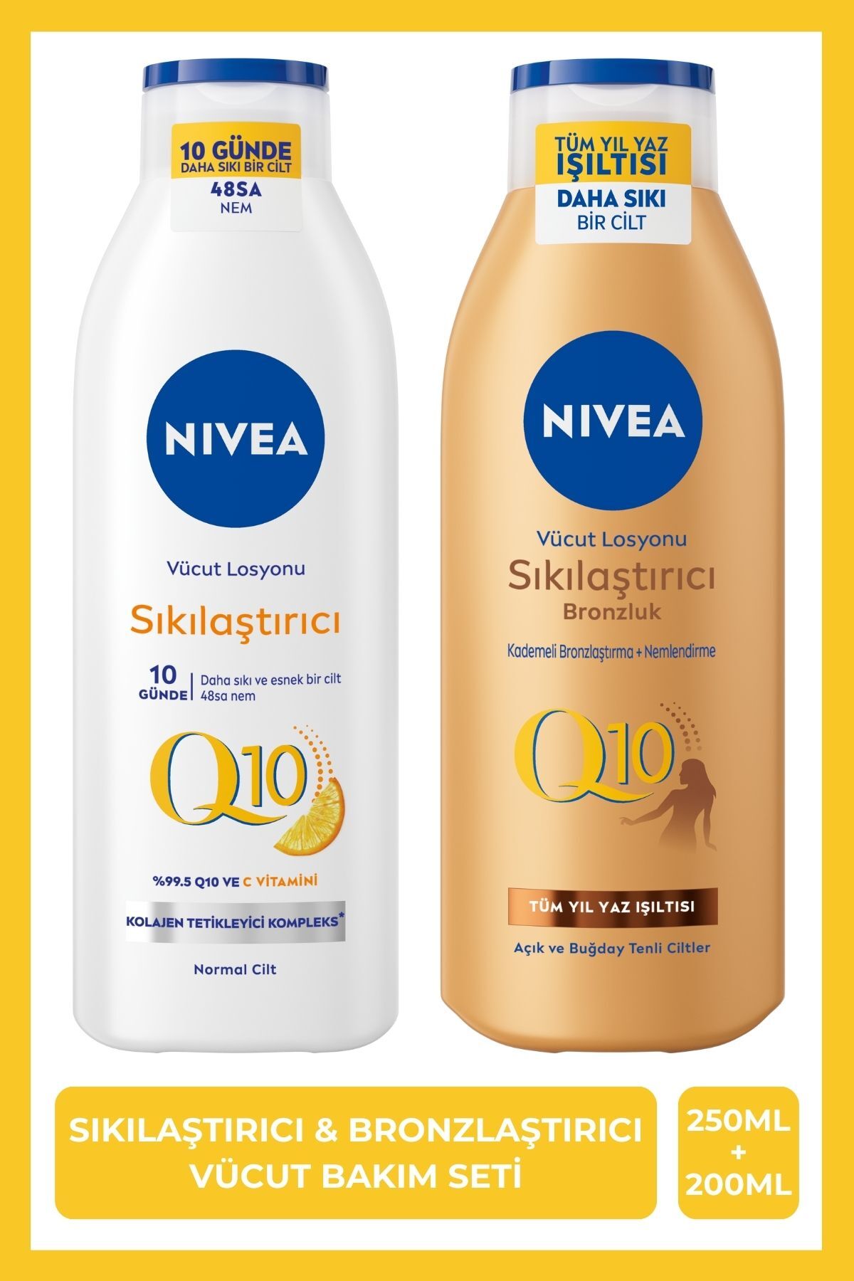 • NIVEA Q10 Sikilastirici Vücut Losyonu ile siki ve elastik bir cilde hazir misin?• Içerigindeki Q10 ve C vitamini ile gelistirilmis formülü sayesinde cilt 10 günde gözle görülür derece sikilasmasina ve esnekliginin artmasini saglar.