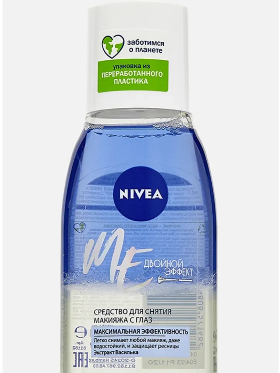 Средство для удаления макияжа с глаз двойной эффект от NIVEA эффективно удаляет даже водостойкий макияж, и, благодаря двухфазной формуле с экстрактом василька, защищает от повреждения ресницы. Оно идеально и бережно очищает кожу вокруг глаз и не оставляет ощущения жирности и липкости. Эффективно удаляет даже экстремальную водостойкую тушь для ресниц и стойкий макияж. Средство для удаления макияжа с глаз двойной эффект от NIVEA подходит даже для чувствительной кожи и не щиплет глаза при использовании. Подходит при использовании контактных линз. Применение: смочите ватные диски средством для удаления макияжа с глаз Двойной эффект и приложите их плотно к глазам на 10-15 секунд. Проведите несколько раз по ресницам, удалив остатки макияжа.