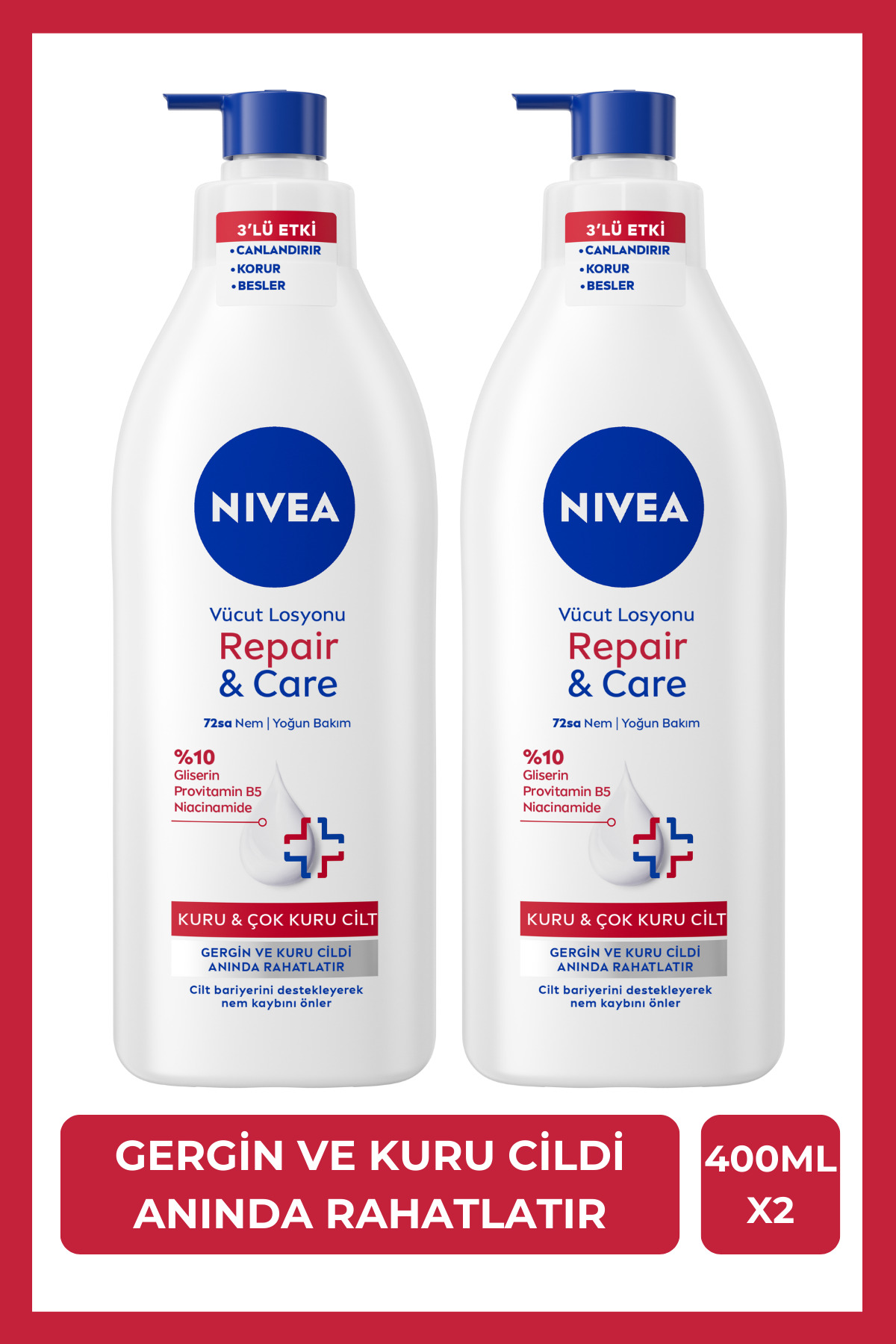 100 Yillik cilt bakim uzmani NIVEA'dan NIVEA Repair Care Vücut Losyonu, çok kuru ciltlerin gerginligini düzenli kullanimda 72 saat boyunca rahatlatir.