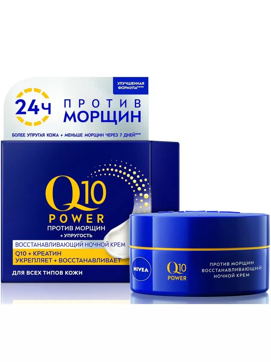 Nivea Q10 Power, Восстанавливающий ночной крем для лица против морщин 50 мл. Коэнзим Q10 и Креатин — естественные активные компоненты, которые содержатся в клетках кожи. Со временем их уровень снижается: кожа теряет способность к самозащите от неблагоприятного воздействия факторов внешней среды. В результате появляются новые морщины, а существующие - становятся глубже. Линия антивозрастных средств для кожи Nivea Q10 Power содержит родственные коже компоненты Коэнзим Q10 и Креатин, которые эффективно борются с морщинами и замедляют процесс старения кожи. Восстанавливающий ночной крем для лица Nivea Q10 Power против морщин делает кожу более упругой (через 2 недели при ежедневном использовании) и заметно сокращает морщины (через 4 недели при ежедневном использовании). Стимулирует процесс регенерации кожи во время сна, когда действие крема особенно эффективно. Подходит для всех типов кожи. Результат: морщины заметно сокращаются, ваша кожа выглядит моложе.
