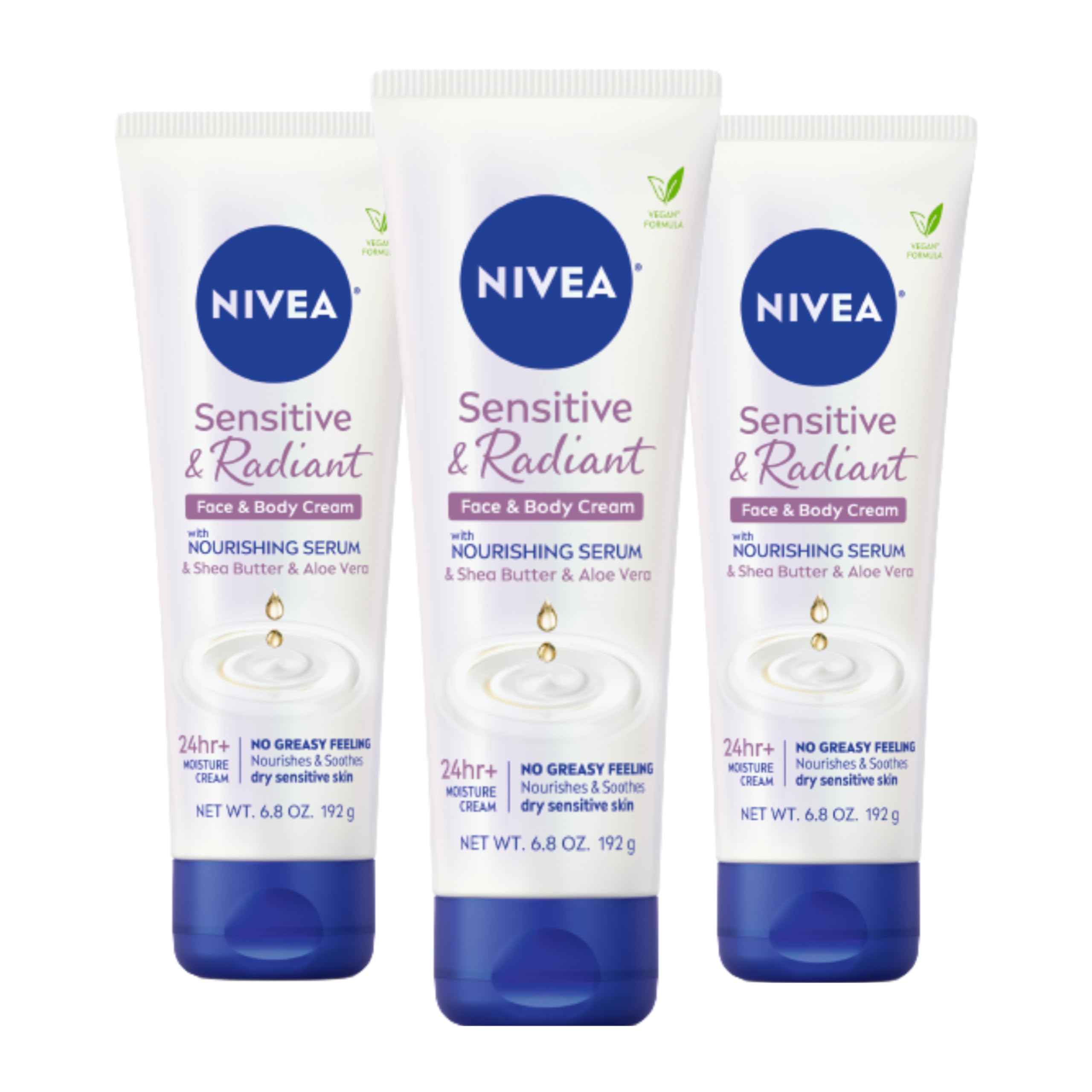 NIVEA Sensitive and Radiant Face and Body Cream for Dry, Sensitive Skin, Vegan Body and Face Moisturizer with Shea Butter and Aloe Vera, 6.8 Oz Tube, Pack of 3