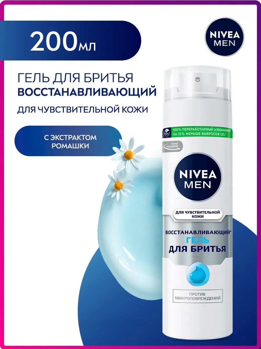 "Бритье может провоцировать раздражение на коже и вызывать покраснение. С этими проблемами поможет справиться восстанавливающий** гель для бритья для чувствительной кожи от NIVEA MEN с экстрактами ромашки и солодки, которые известны своими заживляющими свойствами. Не содержит этилового спирта. Дерматологически протестировано. Гель для бритья специально для мужчин с чувствительной кожей. Рекомендуется дополнить уход, используя бальзам после бритья из восстанавливающей линейки для чувствительной кожи от NIVEA MEN. Применение: выдавите на ладонь и нанесите гель на влажную кожу лица. Побрейтесь и умойтесь водой, после чего налейте небольшое количество средства после бритья в ладонь, нанесите на лицо и шею после бритья аккуратными массирующими движениями, избегая области вокруг глаз.