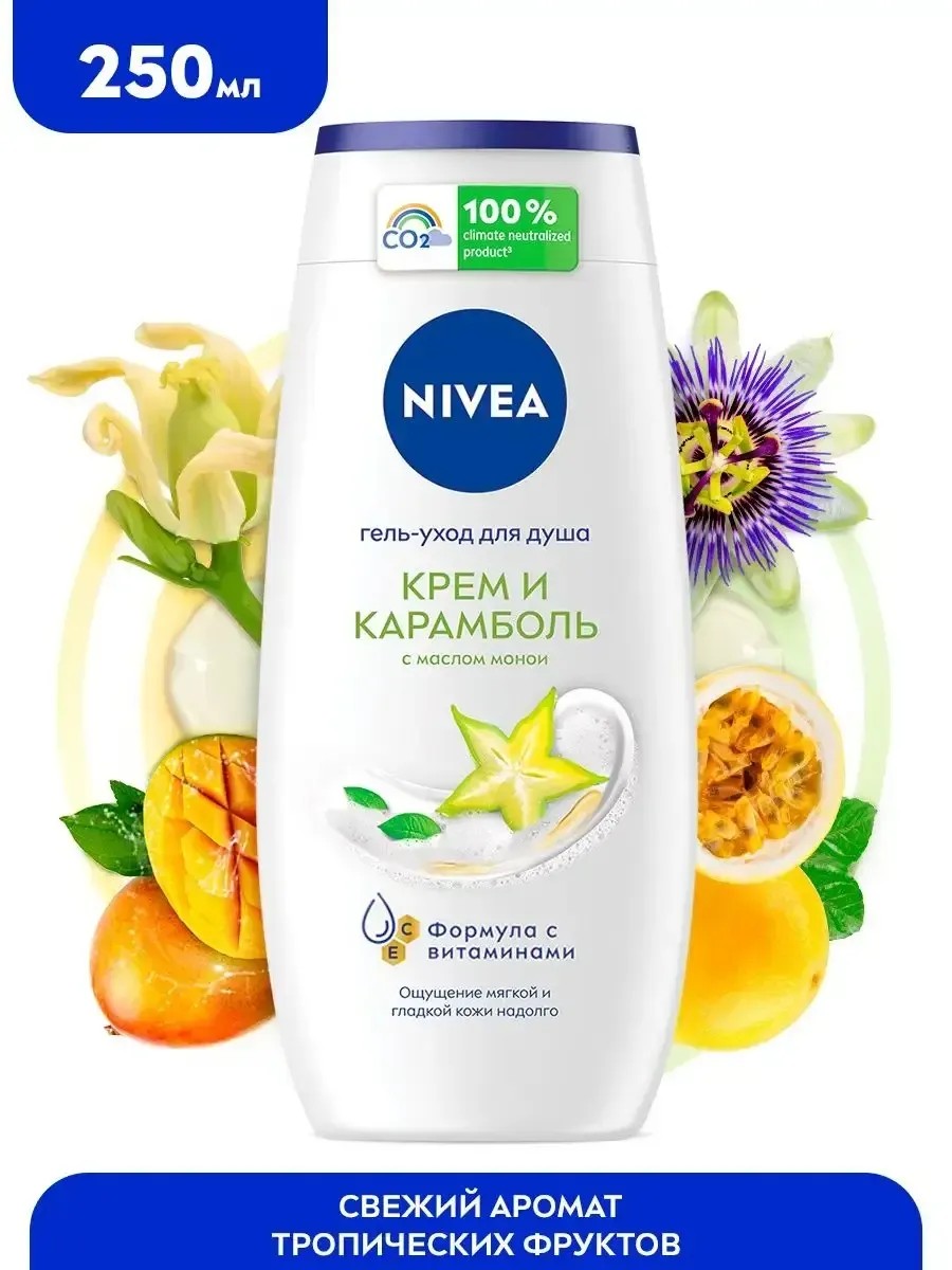 Попробуйте гель-уход для душа «Крем и Карамболь» с маслом монои для всех типов кожи от NIVEA. Гель для душа с маслом монои заботится о коже, делая ее невероятно мягкой. Нежный аромат тропических фруктов пробудит Ваши чувства и подарит ощущение заботы о Вашей коже. Превратите ежедневное принятие душа в момент истинного наслаждения и заботы о себе. pH-сбалансировано. Дерматологически протестировано. Можно использовать с мочалкой для скрабирования кожи.