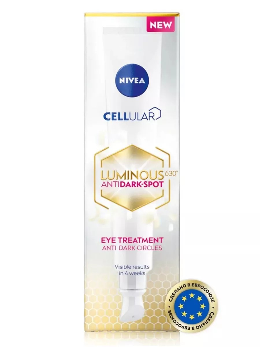 Nivea Крем для кожи вокруг глаз против темных кругов, 15 мл. Крем для кожи вокруг глаз LUMINOUS 630 против темных кругов - это дерматологически протестированная формула для эффективной борьбы с темными кругами под глазами. Крем, содержащий в составе активный ингредиент LUMINOUS 630 и обогащенный гиалуроновой кислотой'' и кофеином: Борется с пигментацией, осветляя темные круги под глазами. Глубоко увлажняет кожу и помогает сократить морщинки. Уменьшает мешки под глазами. Для сияющей и молодо выглядящей кожи вокруг глаз.