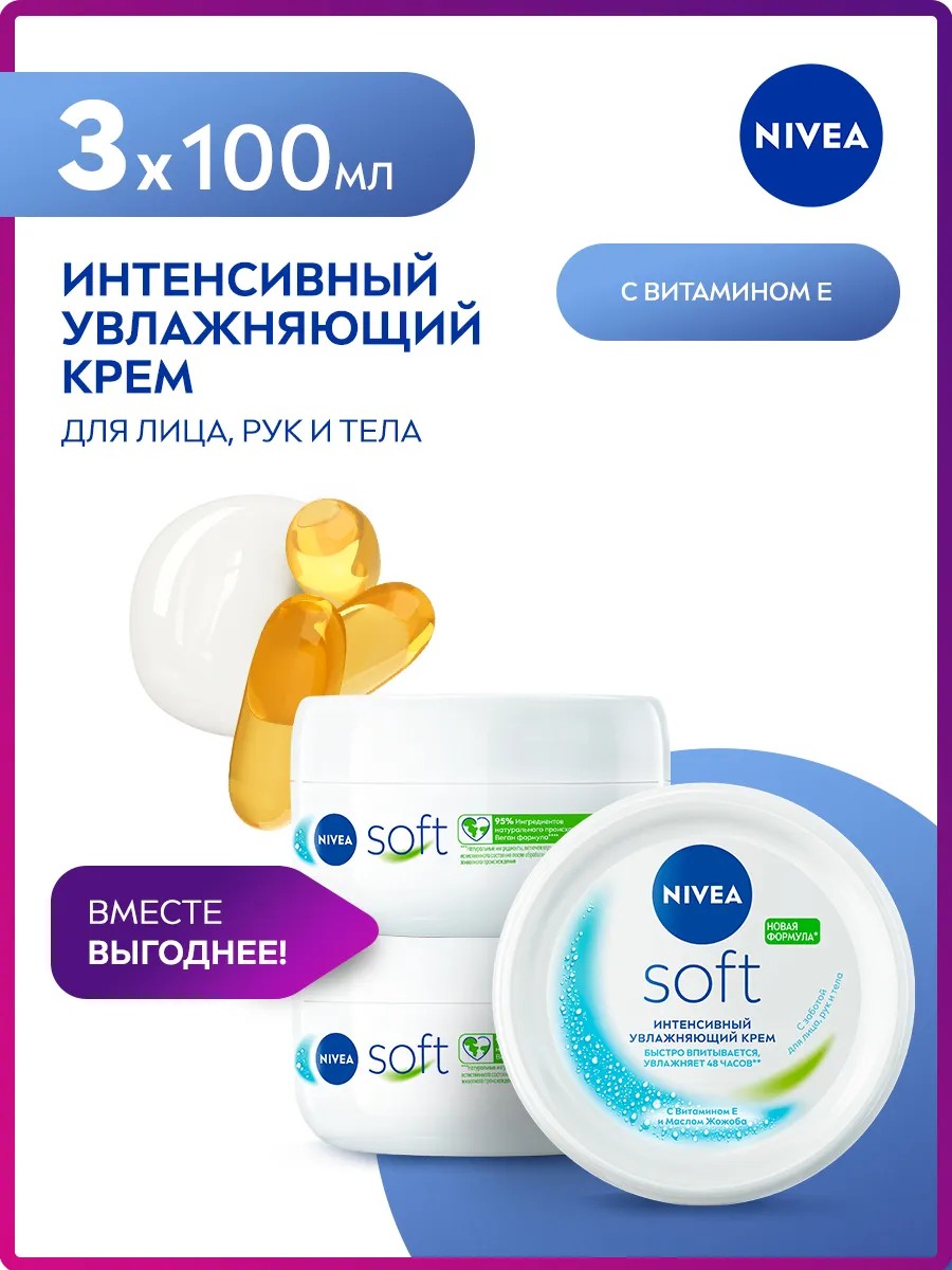 Интенсивный увлажняющий крем NIVEA Soft разработан для ежедневного ухода за кожей лица, рук и тела. Новая улучшенная формула* увлажняет 48 часов**. Благодаря легкой текстуре с Витамином Е и Маслом Жожоба крем быстро впитывается и дарит Вашей коже ощущение нежности. Универсальный крем NIVEA Soft подходит для всех типов кожи. Попробуйте Интенсивный увлажняющий крем Soft от NIVEA и ощутите длительное освежающее увлажнение кожи.
