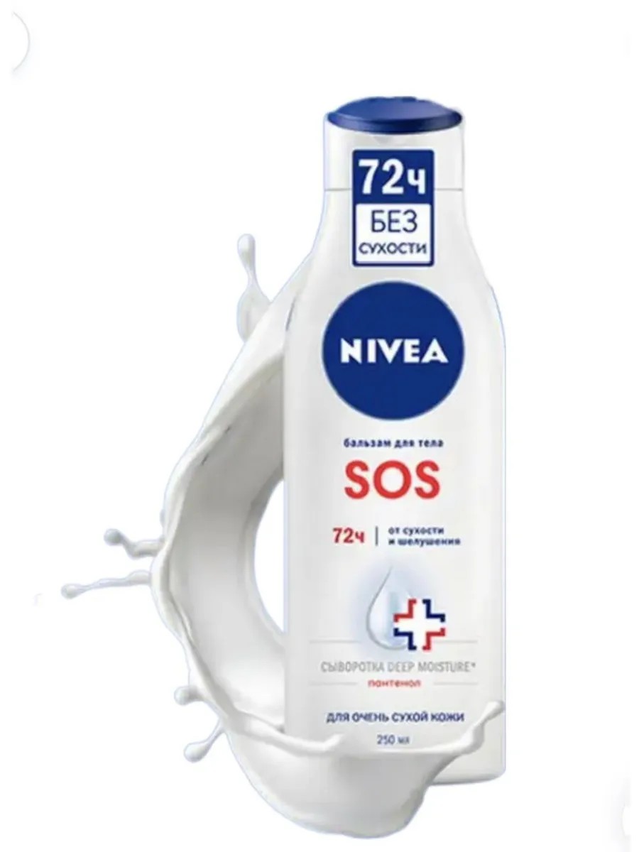 Суперпитательный нежирный бальзам для тела Nivea SOS для интенсивного увлажнения очень сухой и склонной к шелушению кожи. Обогащенный пантенолом (провитамин B5) и сывороткой Deep Moisture (Глубокое Увлажнение) состав усиливает способность кожи удерживать влагу и успокаивает особо сухие участки кожи. Избавляет от ощущения сухости и стянутости кожи на 72 часа при регулярном использовании. Способ применения: немного средства налить в ладони и втирать в кожу круговыми массажными движениями, распределяя по всему телу. Не стоит использовать сразу большое количество. От этого ваша кожа не впитает в себя больше полезных компонентов. Она возьмет себя столько, сколько ей необходимо. Остатки будут находиться на поверхности, предоставляя вам дискомфорт. Повторно увлажните особо сухие участки - локти, коленки, голени.