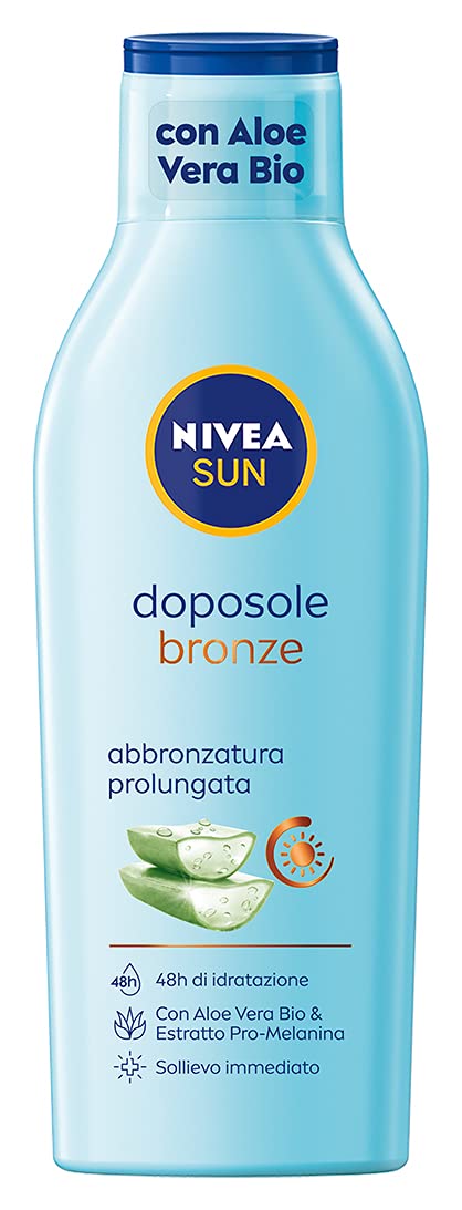 Nivea Sun after-Sun Bronze with Bio-Aloe Vera and Pro-Melanin extract-the after-Sun that extends the tan. Nivea Sun after-Sun Bronze is a body lotion that refreshes the skin and supplies it with moisture for 48 hours.Its light formula enriched with bio-aloe vera and pro melanin extract soothes the skin, extends the natural browning and donates 48 hours of moisture.After sun milk prevents peeling and is also easily absorbed by the skin, which remains soft and smooth.The Nivea Sun after-Sun body lotion does not contain mineral oils and parabens, and its skin tolerance is dermatologically confirmed.It is recommended to use regular use after sunbathing. Product advantages: * 2 x after sun tanning milk * Offers immediate relief for sun -stressed skin * Formula with organic aloe vera and pro-melanin extract * Bright and permanent browning * Hydration for 48h * Light formula, does not grease the skin and easily absorbs. * Without mineral oils and without parabens delivery- Nivea sun after sun milk bronze, after sole aloe vera bio and pro melanin extract for long-lasting and radiant tan, 2 bottles of 200 ml, article number: 86039. Without parabens- the anusSun cream does not contain parabens and mineral oils, so it is a particularly well suited product for skin protection.Fast recording-the after-sun cream does not grease and do not stick, easily pulls in and prevents peeling, for always smooth and velvety skin.Browning intensity-the light formula with bio-aloe vera and pro melanin extract This after the sun extends the natural browning and keeps the skin soft.Soothing effect - this moisturizing body soothes the skin that is exposed to the sun and maintains it for 48 hours, leaves it soft and offers immediate relief. NIVEA SUN After-Sun Bronze mit Bio-Aloe Vera und Pro-Melanin-Extrakt - Das After-Sun, das die Bräunung verlängert. NIVEA Sun After-Sun Bronze ist eine Körperlotion, die die Haut erfrischt und sie für 48 Stunden mit Feuchtigkeit versorgt. Seine leichte Formel angereichert mit Bio-Aloe Vera und Pro-Melanin-Extrakt beruhigt die Haut, verlängert die natürliche Bräunung und spendet 48 Stunden Feuchtigkeit. After Sun Milch verhindert Abblättern und wird zudem leicht von der Haut aufgenommen, was weich und glatt bleibt. Die NIVEA SUN After-Sun-Körperlotion enthält keine Mineralöle und Parabene, und ihre Hautverträglichkeit ist dermatologisch bestätigt. Es wird empfohlen, die regelmäßige Anwendung nach dem Sonnenbad zu verwenden. Produktvorteile: * 2 x After Sun Bräunungsmilch * Bietet sofortige Linderung für sonnengestresste Haut * Formel mit Bio-Aloe Vera und Pro-Melanin-Extrakt * Leuchtende und dauerhafte Bräunung * Hydratation für 48h * Leichte Formel, fettet nicht die Haut und zieht leicht ein. * Ohne Mineralöle und ohne ParabeneLieferumfang - NIVEA SUN After Sun Milch Bronze, After Sole Aloe Vera Bio und Pro-Melanin-Extrakt für langanhaltende und strahlende Bräune, 2 Flaschen à 200 ml, Artikelnummer: 86039. OHNE Parabene - Die After-Sonne-Creme enthält keine Parabene und Mineralöle, daher ist es ein besonders gut geeignetes Produkt für den Hautschutz. Schnelle Aufnahme – Die After-Sun-Creme fettet nicht und klebt nicht, zieht leicht ein und beugt Schälen vor, für eine immer glatte und samtige Haut. Bräunungsintensivator – Die leichte Formel mit Bio-Aloe Vera und Pro-Melanin-Extrakt dieses nach der Sonne verlängert die natürliche Bräunung und hält die Haut weich. Beruhigende Wirkung – Dieser feuchtigkeitsspendende Körper beruhigt die Haut, die der Sonne ausgesetzt ist, und pflegt sie für 48 Stunden, hinterlässt sie weich und bietet sofortige Linderung.NIVEA SUN Milch Nach-Sole Bronze 2 x 200 ml, After-Sonnencreme mit Aloe Vera Bio und Pro-Melanin-Extrakt, After Sole Verlängerung Bräunung und Feuchtigkeitscreme für 48 h