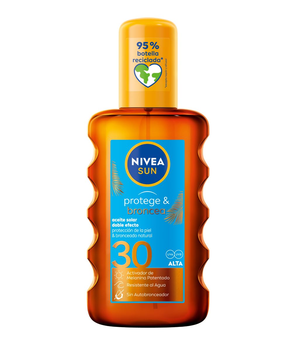 : Nivea SUN PROTEGE BRONCEA aceite SPF30, Sunscreen, for Unisex Adults. Directions for use: Apply for 30 minutes of sun exposure. Reapply every 2 hours or after swimming sweating. Use in combination with other sun protection measures.Texture: Oil. Skin type: All skin types. SPF protection: High (SPF 30 – SPF 50 ).Description du produit Nivea SUN PROTEGE BRONCEA aceite SPF30, Crème solaire, pour Unisexe Adulte Mode d'emploi Utilisez 30 minutes pour l'exposition au soleil. Réutiliser toutes les 2 heures ou après la natation la transpiration. Utilisation en combinaison avec d'autres mesures de protection solaire.Textures: Huile. Type de peau: Tous types de peaux. Protection SPF: Haute (SPF 30 – SPF 50 ).Nivea Sun Protege Broncea Acète SPF30 Crème Solaire 200 ml (Lot de 1) SPF 30
