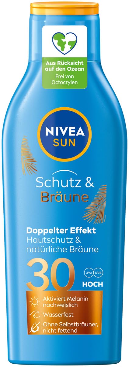 NIVEA Sun Schutz Braune sunscreen LSF 30 - for a long -lasting, beautiful tan The NIVEA Sun Schutz Braune sunscreen with LSF 30 offers immediate and highly effective UVA and UVB protection against sunburn and premature skin aging, it quickly absorbs and does not grease.The formula with pro-melanin extract also activates the skin's own melanin production (in vitro) and thus supports the natural browning process for an even and healthy-looking tan-without any self-tanned. Out of consideration for the ocean, the Nivea Sun sunscreen is free of Octinoxate, Oxybenzon and Octocrylen and does not contain any microplastics.The formula is also 76 biodegradable. Application: 1. Shake the bottle well 2. Apply generously 3. Cream up several times a day The product advantages in detail: Sun milk with LSF 30 (high) UVA UVB filter system With pro-melanin extract Free of octinoxate, oxybenzon octocrylenic Formula without microplastics 76 biodegradable Water resistant Important application information Apply generously before sunbathing, especially after bathing, sweating, sweating or drying, to maintain protection • Small application quantities reduce the protection of protection • Avoid excessive sunlight • Even sunscreen with high light protection factor does not offer complete protection against UV rays •Excessive sunbathing is a serious health risk • Babies and toddlers protect against direct sunlight, use sunscreen with a high sun protection factor (SPF 25) and use protective clothing • Avoid intensive lunch sun • Each sunburn damages the skin sustainable and is to be avoided.Avoid contact with textiles and hard surfaces to prevent discoloration • Dermatologically confirmed skin compatibility. Address manufacturer importer Beiersdorfstraße 1-9, 20245 HamburgScope of delivery details-Nivea Sun protection tan sunscreen LSF 30 (200 ml), non-fatty sunscreen for a natural tan without self-tan, article number 85825. Waterproof formula-the reliable Nivea sunscreen convinces with your waterproofFormula.The skin tolerance is dermatologically tested.Skin environment-Out of consideration for the ocean, the formula of the sun lotion is free of microplastics and the UV filters octocrylen, octinoxate and oxybenzon.Activates tan-the formula with pro-melanin extract activates the skin's melanin production (in vitro) and thus supports the natural browning process.Protection tan - sun protection and natural tan in one: The non -fatty sun lotion quickly moves in and ensures an even and beautiful tan.NIVEA SUN Schutz Bräune Sonnencreme LSF 30 – für eine langanhaltende, schöne Bräune Das NIVEA SUN Schutz Bräune Sonnencreme mit LSF 30 bietet sofortigen und hochwirksamen UVA- und UVB-Schutz gegen Sonnenbrand sowie vorzeitige Hautalterung, dabei zieht sie schnell ein und fettet nicht. Die Formel mit Pro-Melanin-Extrakt aktiviert außerdem die hauteigene Melanin-Produktion (in vitro) und unterstützt damit den natürlichen Bräunungsprozess für eine ebenmäßige und gesund aussehende Bräune - ganz ohne Selbstbräuner. Aus Rücksicht auf den Ozean ist die Nivea SUN Sonnencreme frei von Octinoxat, Oxybenzon und Octocrylen und enthält kein Mikroplastik. Die Formel ist außerdem zu 76 biologisch abbaubar. Anwendung: 1. Flasche gut schütteln 2. Großzügig auftragen 3. Mehrfach täglich nachcremen Die Produktvorteile im Detail: Sonnenmilch mit LSF 30 (Hoch) UVA UVB-Filtersystem Mit Pro-Melanin-Extrakt Frei von Octinoxat, Oxybenzon Octocrylen Formel ohne Mikroplastik zu 76 biologisch abbaubar Wasserfest WICHTIGE ANWENDUNGSHINWEISE Vor dem Sonnen großzügig auftragen • Mehrfach auftragen, speziell nach dem Baden, Schwitzen oder Abtrocknen, um den Schutz aufrecht zu erhalten • Geringe Auftragungsmengen reduzieren die Schutzleistung • Meiden Sie übermäßige Sonnenbestrahlung • Auch Sonnenschutzmittel mit hohem Lichtschutzfaktor bietet keinen vollständigen Schutz vor UV-Strahlen • Übermäßiges Sonnenbaden stellt ein ernsthaftes Gesundheitsrisiko dar • Babys und Kleinkinder vor direkter Sonneneinstrahlung schützen, Sonnenschutzmittel mit hohem Lichtschutzfaktor (LSF größer 25) sowie schützende Kleidung verwenden • Intensive Mittagsonne vermeiden • Jeder Sonnenbrand schädigt die Haut nachhaltig und ist zu vermeiden • Vollständig einziehen lassen und direkten Kontakt mit Textilien und harten Oberflächen vermeiden, um Verfärbungen vorzubeugen • Hautverträglichkeit dermatologisch bestätigt. ANSCHRIFT HERSTELLER IMPORTEUR Beiersdorfstraße 1-9, 20245 HamburgLieferumfang Details – NIVEA SUN Schutz Bräune Sonnencreme LSF 30 (200 ml), nicht fettende Sonnencreme für eine natürliche Bräune ohne Selbstbräuner, Artikelnummer 85825. Wasserfeste Formel – Die zuverlässige NIVEA Sonnencreme überzeugt mit ihrer wasserfesten Formel. Die Hautverträglichkeit ist dermatologisch bestätigt. Haut Umwelt – Aus Rücksicht auf den Ozean ist die Formel der Sonnenlotion frei von Mikroplastik und den UV-Filtern Octocrylen, Octinoxat und Oxybenzon. Aktiviert Bräune – Die Formel mit Pro-Melanin-Extrakt aktiviert die hauteigene Melanin-Produktion (in vitro) und unterstützt damit den natürlichen Bräunungsprozess. Schutz Bräune – Sonnenschutz und natürliche Bräune in einem: Die nicht fettende Sonnenlotion zieht schnell ein und sorgt für eine ebenmäßige und schöne Bräune.NIVEA SUN Schutz Bräune Sonnencreme LSF 30 (200 ml), Sonnenmilch mit Pro-Melanin-Extrakt für eine ebenmäßige Bräune, sofortiger Sonnenschutz mit UVA UVB-Filtersystem