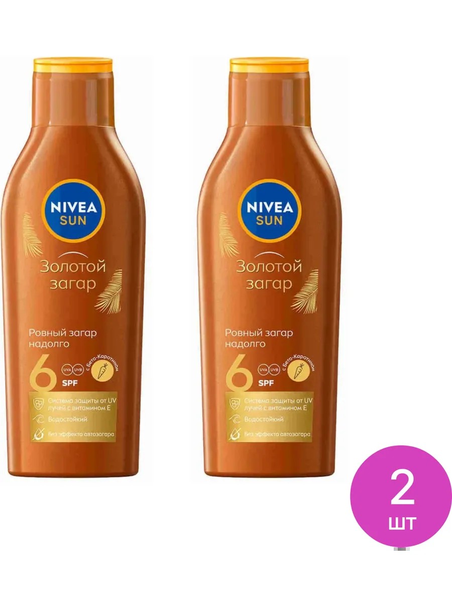 Комплект состоит из 2 шт. Цена за комплект. На курорте важно обезопасить себя и свое тело от солнечных лучей, так как это приводит к тому, что кожа будет огрубевшей, морщинистой с пигментными пятнами. Nivea Sun Солнцезащитное средство Золотой загар SPF-6 - это инновационное средство для защиты от солнца с витамином Е и каротином. Средство солнцезащитное успокаивает кожу. Способствует скорейшему восстановлению поврежденной поверхности эпидермиса. Каротин питает, смягчает и увлажняет кожу, запускают процессы регенерации. Витамин Е - антиоксидант - питает и обновляет кожу. Благодаря солнцезащитному средству ваша кожа сохранит молодость и здоровье! Защита от солнца / солнцезащитные средства для тела и лица / солнцезащитный лосьон для тела.