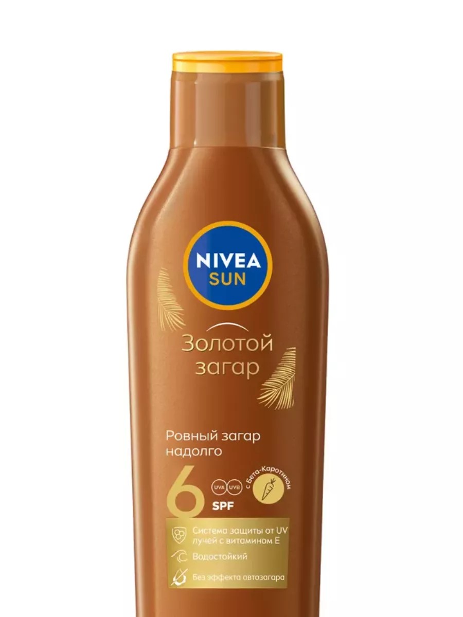 Попробуйте солнцезащитный лосьон для тела «Золотой загар» SPF 6 от NIVEA SUN в объеме 200 мл. Ровный загар надолго. Формула солнцезащитного лосьона «Золотой загар» с Бета-Каротином и Витамином Е помогает загару лучше ложиться и дольше оставаться на коже. Защищает от UVA и UVB лучей. Водостойкий. Без эффекта автозагара. Дерматологически протестировано.