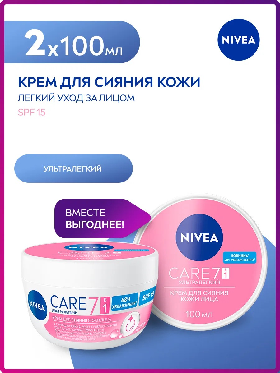 ПОПРОБУЙТЕ НОВИНКУ'! Ультралегкий крем для сияния кожи лица 7в1 NIVEA Care с SPF 15 — это ежедневный уход, который раскрывает естественное сияние вашей кожи. Обогащённый экстрактом жемчуга, он выравнивает тон кожи, делает её более сияющей и привлекательной.