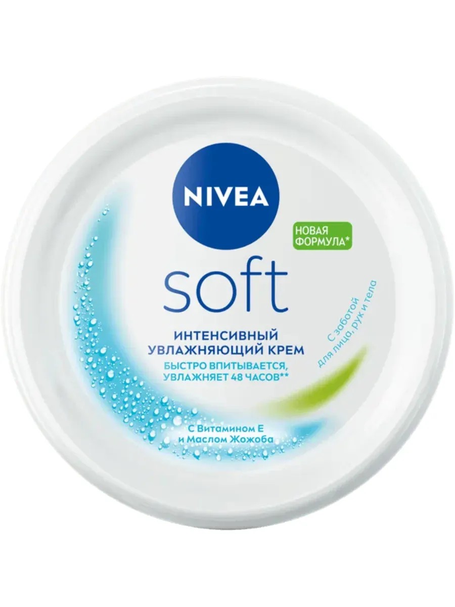 Интенсивный увлажняющий крем NIVEA Soft разработан для ежедневного ухода за кожей лица, рук и тела. Новая улучшенная формула увлажняет 48 часов. Благодаря легкой текстуре с Витамином Е и Маслом Жожоба крем быстро впитывается и дарит Вашей коже ощущение нежности. Универсальный крем NIVEA Soft подходит для всех типов кожи. Попробуйте Интенсивный увлажняющий крем Soft от NIVEA и ощутите длительное освежающее увлажнение кожи.
