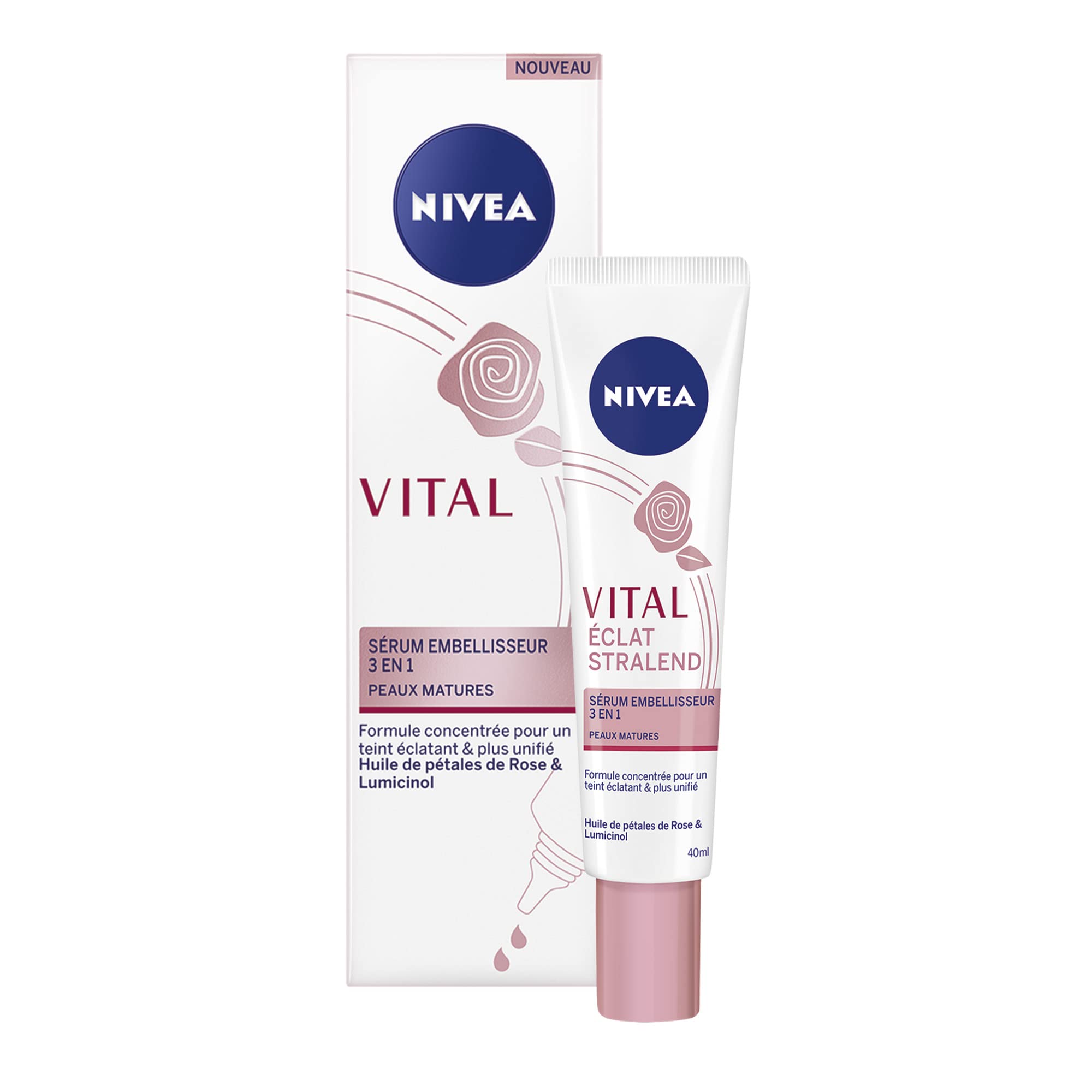 NIVEA Mature Skin 3-in-1 Beautifying Serum – Nourishes dry and mature skin, for a fresh and radiant complexion! Every day, our skin is subjected to different challenges and without appropriate care, it lacks hydration and suppleness. Our face needs to be pampered and protected to face long days! This vital radiance treatment from NIVEA takes care of your skin and restores its vivacity and tone. Its formula enriched with rose petal oil and lumicinol nourishes your skin and beautifies it. The facial treatment makes wrinkles less visible and leaves you with radiant skin. The face serum evens out your complexion and gives it a pretty pink color. Your skin is noticeably firmer. Apply the serum every day, directly to the spots, after cleansing your face. Pigment spots will be significantly less visible after 4 weeks of use . Ideal for pampering your skin and feeling good inside! The benefits of NIVEA anti-wrinkle facial serum: Enriched with rose petal oil and lumicinol Helps fade spots and reduce wrinkles Makes skin noticeably firmer Developed for mature skin Anti-aging treatment, provides a radiant and even complexion Study carried out on 46 women 4 weeksPackaging – NIVEA Vital Beautifying Serum 3 IN 1 Mature Skin, moisturizing facial serum, women's facial care that reduces wrinkles and pigment spots, (1 x 50 ml), item number: 89586. Firms the skin – The moisturizing facial care nourishes mature skin, gently hydrates it and firms it. Your skin is noticeably firmer!. Reduces spots – The facial care makes pigment spots less visible, the skin appears more beautiful and even. To feel good about yourself!. Evens out the complexion – NIVEA's anti-wrinkle facial cream gives your skin a radiant complexion. The formula of this women's care gives the skin a beautiful, rosy and even complexion. Reduces wrinkles – This powerful anti-wrinkle cream reduces wrinkles thanks to its formula rich in rose petal oil and lumicinol. For skin that stays beautiful!. Sérum Embellisseur 3-en-1 Peaux Matures de NIVEA – Nourrit les peaux sèches et matures, pour un teint frais et éclatant ! Chaque jour, notre peau est soumise à différents défis et sans soins adaptés, elle manque d'hydratation et de souplesse. Notre visage a besoin d'être chouchouté et d'être protégé pour faire face à de longues journées ! Ce soin éclat vital de NIVEA prend soin de votre peau et lui redonne de la vivacité et du tonus. Sa formule enrichie en huile de pétales de rose et lumicinol nourrit votre peau et l'embellit. Le soin visage rend les rides moins visibles et vous laisse une peau éclatante. Le sérum visage unifie votre teint et lui offre une jolie couleur rose. Votre peau est sensiblement plus ferme. Appliquez le sérum tous les jours, directement sur les taches, après avoir nettoyé votre visage. Les taches pigmentaires seront nettement moins visibles dès 4 semaines d'utilisation . Idéal pour chouchouter votre peau et vous sentir bien dedans ! Les bienfaits du sérum visage anti-rides de NIVEA : Enrichie en huile de pétales de rose et en lumicinol Aide à atténuer les taches et à réduire les rides Rend la peau sensiblement plus ferme Développé pour les peaux matures Soin anti-âge, offre un teint éclatant et unifié Etude réalisée sur 46 femmes 4 semainesEmballage – NIVEA Vital Sérum Embellisseur 3 EN 1 Peaux Matures, sérum hydratant visage, soin visage femme qui réduit les rides et taches pigmentaires, (1 x 50 ml), numéro d'article : 89586. Raffermit la peau – Le soin hydratant visage nourrit les peaux matures, les hydrate de manière douce et les raffermit. Votre peau est sensiblement plus ferme !. Atténue les taches – Le soin visage rend les taches pigmentaires moins visibles, la peau apparaît plus belle et uniforme. Pour se sentir bien dans sa peau !. Unifie le teint – L'anti-ride visage de NIVEA offre à votre peau un teint éclatant. La formule de ce soin femme donne à la peau un joli teint rosé et unifié. Réduit les rides – Cet anti-ride puissant réduit les rides grâce à sa formule riche en huile de pétales de rose et en lumicinol. Pour une peau qui reste belle !.