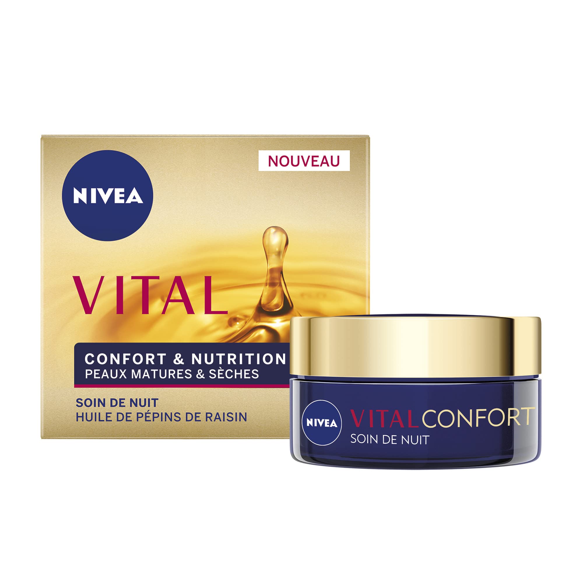 Every age has its strength – NIVEA Vital Comfort Nutrition Night Care: for women who are happy with their lives and feel good about their skin VITAL is a range of care products designed to meet the specific needs of mature skin in order to bring them well-being and comfort. NIVEA Vital Comfort Nutrition Night Care cream is enriched with Grape Seed Oil and Shea Butter. This complex of ingredients intensely nourishes the skin and hydrates it for 48 hours, while regenerating it overnight. NIVEA treatment with a creamy texture is suitable for mature and very dry skin, it accompanies you every day, whatever your age or your desires. This formula with nourishing properties provides an immediate feeling of comfort. The skin is firmer, softer and supple. She is full of vitality. For optimal action, complete your routine with other Day Care from the NIVEA VITAL range. The benefits of this cream: Anti-aging treatment that intensely nourishes and regenerates the skin Creamy cream enriched with Grape Seed Oil and Shea butter Nourishing formula dedicated to mature and very dry skin The skin is firmer, softer and supple Hydration for 48 hours for skin full of vitalityPackaging – NIVEA Vital Comfort Nourishment Night Cream, women's face cream jar enriched with Grape Seed Oil Shea Butter 1 x 50 ml, item number: 84974. Beauty tips – Apply this nourishing NIVEA Vital cream regularly for an immediate feeling of comfort. Your skin will feel firmer, softer and more supple. NIVEA Cream – This creamy texture nourishes mature and dry skin while providing softness and suppleness as well as 48 hours of hydration. Night Cream – This night cream works in harmony with the skin's regeneration process during the night. When you wake up, your skin will be full of vitality. Moisturizing Face Cream – Enriched with Grape Seed Oil Shea Butter, the cream intensely nourishes the skin for an immediate feeling of comfort. À chaque âge sa force – NIVEA Vital Soin de Nuit Confort Nutrition : pour les femmes bien dans leur vie et dans leur peau VITAL est une gamme de soins conçue pour répondre aux besoins spécifiques des peaux matures afin de leur apporter bien-être et réconfort. La crème NIVEA Vital Soin de Nuit Confort Nutrition est enrichie en Huile de Pépins de Raisin et beurre de Karité. Ce complexe d'ingrédients permet de nourrir intensément la peau et l'hydrate pendant 48 heures, tout en la régénérant durant la nuit. Le soin NIVEA à la texture onctueuse est adapté aux peaux matures et très sèches, il vous accompagne au quotidien, quel que soit votre âge ou vos désirs. Cette formule aux propriétés nourrissantes apporte une sensation immédiate de confort. La peau est plus ferme, douce et souple. Elle est pleine de vitalité. Pour une action optimale, complétez votre routine avec les autres Soins de Jour de la gamme NIVEA VITAL. Les bénéfices de cette crème : Soin anti-âge qui nourrit intensément et régénère la peau Crème onctueuse enrichie en Huile de Pépins de Raisin et beurre de Karité Formule nourrissante dédiée aux peaux matures et très sèches La peau est plus ferme, douce et souple Hydratation pendant 48 heures pour une peau pleine de vitalitéEmballage – NIVEA Vital Soin de Nuit Confort Nutrition, pot de crème visage femme enrichi en Huile de Pépins de Raisin beurre de Karité 1 x 50 ml, numéro d'article : 84974. Conseils beauté – Appliquez régulièrement ce soin NIVEA Vital nourrissant pour sensation immédiate de confort. Votre peau est plus ferme, douce et souple. Crème NIVEA – Ce soin à la texture onctueuse nourrit les peaux matures et sèches tout en leur apportant douceur et souplesse ainsi que 48 heures d'hydratation. Soin nuit – Cette crème nuit agit en harmonie avec le processus de régénération de la peau pendant la nuit. Au réveil, votre peau est pleine de vitalité. Crème hydratante visage – Enrichi en Huile de Pépins de Raisin beurre de Karité, le soin nourrit intensément la peau pour une sensation immédiate de confort.
