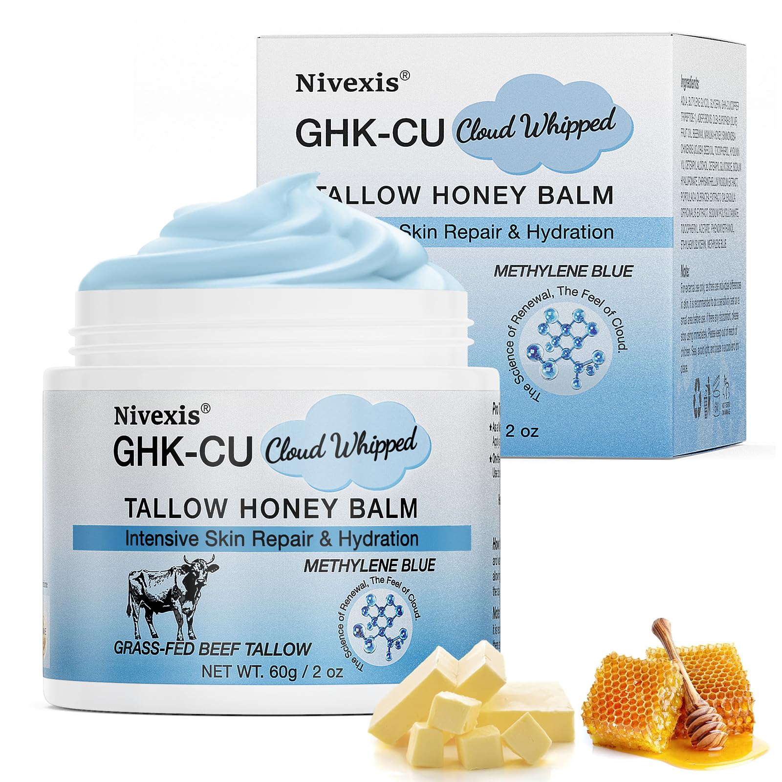 Nivexis Copper Peptides GHK-Cu Whipped Beef Tallow for Skin, Grass Fed Beef Tallow and Honey Balm for Face & Body, with Methylene Blue Anti-Aging Moisturizer, Suitable for All Skin Types, 2 Oz