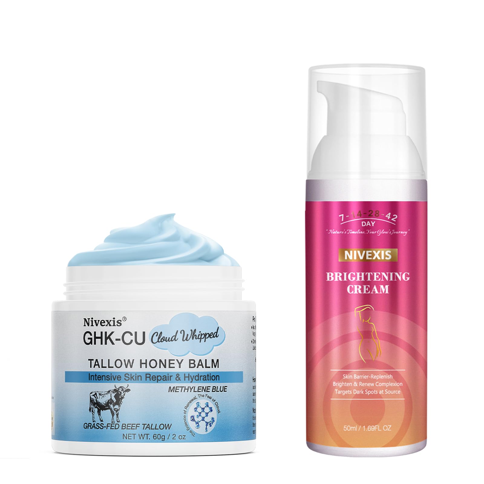 The Copper Peptides Whipped Tallow Balm is your ultimate overnight recovery agent. Formulated with bioactive Copper Peptides to stimulate collagen and accelerate repair, blended with nourishing, grass-fed Whipped Tallow that mimics the skin's natural lipids. This rich balm deeply nourishes, fortifies the skin barrier, and targets fine lines, dryness, and irritation while you sleep. The Brightening Body Cream complements this process by working to gently even out skin tone and enhance luminosity. Its potent yet gentle formula helps to diminish the appearance of dark spots, sun spots, and hyperpigmentation, revealing smoother, brighter-looking skin. Used together, this duo creates a synergistic effect: repair and nourish deeply at night, then protect and illuminate by day for comprehensively revitalized skin. Ideal for those seeking to combat signs of aging, dryness, and uneven skin texture, this kit offers a luxurious, results-driven approach to total body skincare.Luxurious, Non-Greasy Feel: Both feature elegant textures that absorb quickly without greess. The balm is deeply nourishing yet breathable, while the cream is lightweight and smooths on evenly. Suitable For All Skin Types: We adhere to gentle skincare formulas, making our products effective and safe for everyone. Nourish Deeply, Brighten Visibly: Our Copper Peptide Tallow Balm intensively replenishes skin, while the Brightening Cream targets dark spots and uneven tone for a radiant, inside-out glow. Effective Tone Correcting: The Brightening Cream gently targets dark spots and uneven pigmentation, promoting a visibly more radiant and uniform skin tone. Intensive Overnight Repair: The Copper Peptides Balm combines bioactive peptides and nourishing tallow to stimulate collagen, repair skin barrier, and soothe dryness while you sleep.