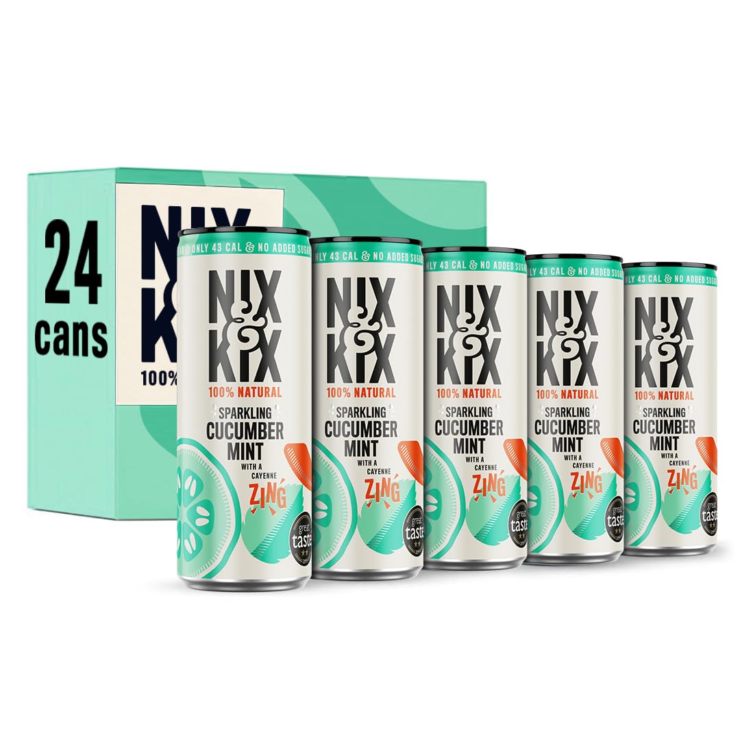 CAYENNE HAPPINESS It surprises most people that a soft drink with no added sugar or chemicals can deliver a kick that inspires that "wow" moment. And it's that instant surprise we love. We add chili peppers to our drinks for a few good reasons: Capsaicin (the heat) in chili peppers has metabolism-boosting and energy-releg properties. Even better: it also increases endorphin levels and provides a natural, happy feeling. The flavor: the kick of chili flavor makes our drinks a less boring choice for afternoon refreshment, while also giving them an edge as a viable late-night soft drink option. Because we add heat to our drinks, we can also keep the overall sugar content much lower than other soft drinks, since there's something more exciting going on than just "sweet." Nix Kix. Our name is a very simple way of saying what's in our drinks and what isn't: The Nix: No refined sugars, all-natural and low in calories. The Kix: The highest quality ingredients, expertly blended with a subtle kick of cayenne pepper for depth of flavor and a surprising twist. Our chilies come from Bedfordshire, home to some of the world's finest chilies. INGREDIENTS Carbonated water, 45 fruit juice from concentrate (apple, cucumber 4 , lime), garden mint and other natural flavorings, chili extract, antioxidant (asorbic acid).Nix Kix Concombre et menthe (24 x 250 ml) Sans sucre ni édulcorants ajoutés Faible en calories Boisson gazeuse naturelle pétillante à faible teneur en glucidesDESCRIPTION DU PRODUIT DESCRIPTION DU PRODUIT CAYENNE HAPPINESS Il surprend la plupart des gens qu'une boisson gazeuse ne contenant pas de sucre ou de produits chimiques ajoutés peut offrir un coup de pied qui inspire ce moment « wow ». Et c'est cette surprise instantanée que nous adorons. Nous ajoutons des piments à nos boissons pour quelques bonnes raisons : la Science Capsaïcine (le piquant) dans les piments a des propriétés de stimulation du métabolisme et de libération d'énergie. Encore mieux : il augmente également les niveaux d'endorphine et procure une sensation naturelle et heureuse. La saveur : le coup de pied de saveur de piment fait de nos boissons un choix moins ennuyeux pour le rafraîchissement de l'après-midi, tout en leur donnant un avantage comme option de boissons gazeuses viables la nuit. Comme nous ajoutons du piquant à nos boissons, nous pouvons également garder la teneur globale en sucre beaucoup plus faible que les autres boissons gazeuses, car il se passe quelque chose de plus excitant que simplement «sucré». Nix Kix Notre nom est une façon très simple de dire ce qui est à l'intérieur de nos boissons et ce qui n'est pas : The Nix : Pas de sucres raffinés, naturels et pauvres en calories. Le Kix : les ingrédients de la plus haute qualité, savamment mélangés avec un subtil coup de pied de Cayenne pour une profondeur de saveur et une touche surprenante. Nos piments proviennent du Bedfordshire où sont cultivés certains des meilleurs piments du monde. INGRÉDIENTS Eau gazeuse, jus de fruits concentrés 45 (pomme, concombre 4 , citron vert), menthe de jardin et autres arômes naturels, extrait de piment, antioxydant (acide asorbique).