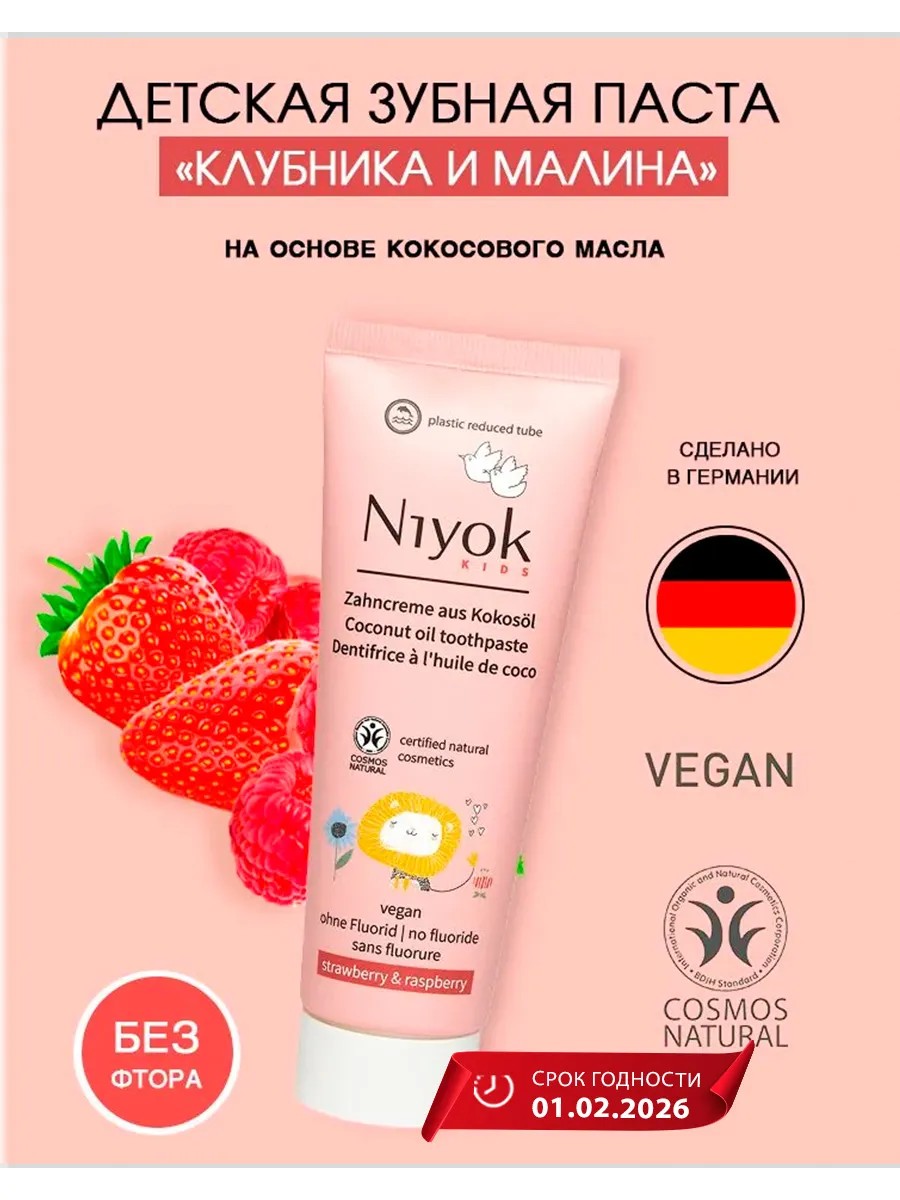 Natural organic children's toothpaste 0+ - a gentle and safe toothpaste for children, with coconut oil and magnolia bark extract. Suitable for babies from their first tooth. 0+. A natural formula for cleanliness and protection of teeth and gums from unwanted bacteria. Coconut oil contains natural antimicrobial components and inhibits the growth of pathogenic microflora. The bright berry flavor of strawberries and raspberries will delight every child. Does not contain fluoride. Certified natural cosmetics COSMOS NATURAL. Suitable for vegans. Niyok (Niyok) is an environmentally friendly and natural cosmetics for everyday use from Germany. As a result of joint research with dentists, unique Niyok toothpastes were developed - using coconut oil for oral care, due to its effective effect on the oral microflora and gentle restoration of the mucous membrane. The brand's concept is certified and vegan ingredients, eco-friendly packaging, and a "transparent" composition. An excellent alternative to synthetic products!
