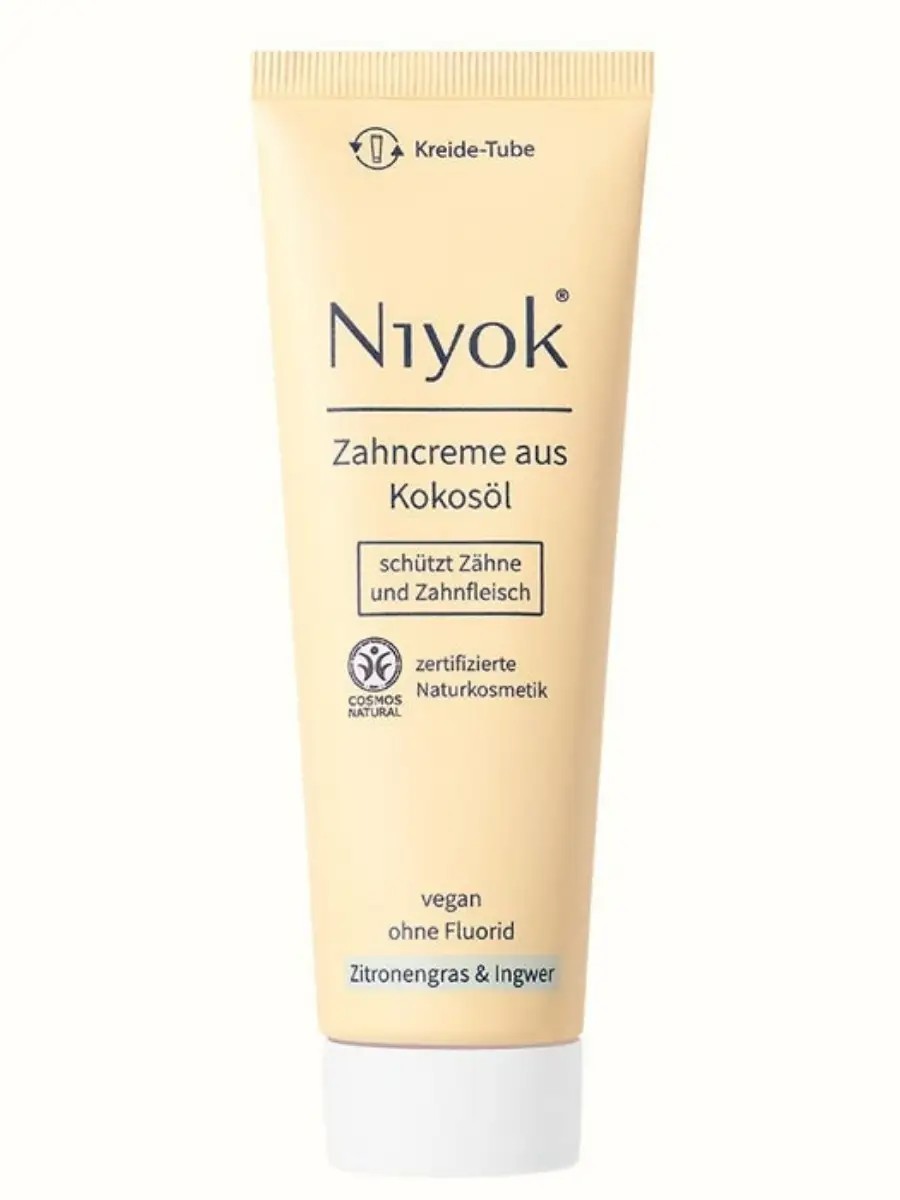 Designed for gourmets who know freshness is possible without mint. This toothpaste will surprise you with a zesty combination of fresh lemongrass and spicy ginger. Formulated with coconut oil, it provides excellent dental and gum hygiene. Fluoride-free. NIYOK toothpastes have an ideal formula: only effective, natural, and high-quality ingredients. The unique properties of coconut oil provide natural, gentle cleansing and protection. Suitable for sensitive teeth and gums. COSMOSNATURAL certified. Vegan-friendly.