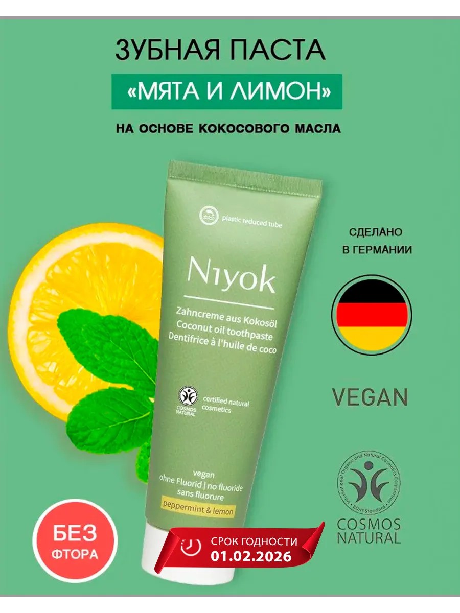 Натуральная органическая зубная паста - мягкая и безопасная, с кокосовым маслом и экстрактом коры магнолии. Природная формулачистоты и защиты зубов и десен от нежелательных бактерий. Кокосовое масло содержит естественные антимикробные компоненты и подавляет размножение патогенной микрофлоры. Двойная свежесть мяты и лимона дарит новые силы и энергию. Не содержит фтора, подходит для чувствительных зубов и десен. Сертифицированная натуральная косметика COSMOS NATURAL. Подходит для веганов. Niyok (Нийок) – это экологичная и натуральная косметика повседневного спроса из Германии. В результате совместных исследований со стоматологами разработаны уникальные зубные пасты Niyok - использование кокосового масла для ухода за полостью рта, благодаря его эффективному воздействию на микрофлору полости рта и бережному восстановлению слизистой. Концепция марки- сертифицированные и веганские ингредиенты, экологичная упаковка и «прозрачный» состав. Отличная альтернатива синтетическим продуктам!