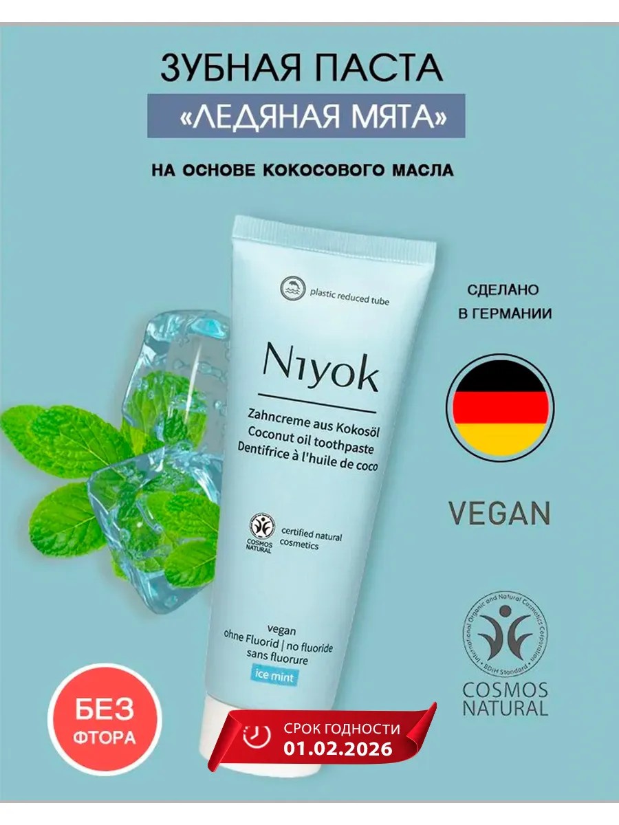 Натуральная органическая зубная паста с охлаждающим эффектом - мягкая и безопасная зубная паста с кокосовым маслом и экстрактом коры магнолии. Природная формулачистоты и защиты зубов и десен от нежелательных бактерий. Кокосовое масло содержит естественные антимикробные компоненты и подавляет размножение патогенной микрофлоры. Впечатляющий вкус свежей мяты создаст великолепное бодрое настроение. Не содержит фтора, подходит для чувствительных зубов и десен. Сертифицированная натуральная косметика COSMOS NATURAL. Подходит для веганов. Niyok (Нийок) – это экологичная и натуральная косметика повседневного спроса из Германии. В результате совместных исследований со стоматологами разработаны уникальные зубные пасты Niyok - использование кокосового масла для ухода за полостью рта, благодаря его эффективному воздействию на микрофлору полости рта и бережному восстановлению слизистой. Концепция марки- сертифицированные и веганские ингредиенты, экологичная упаковка и «прозрачный» состав. Отличная альтернатива синтетическим продуктам!