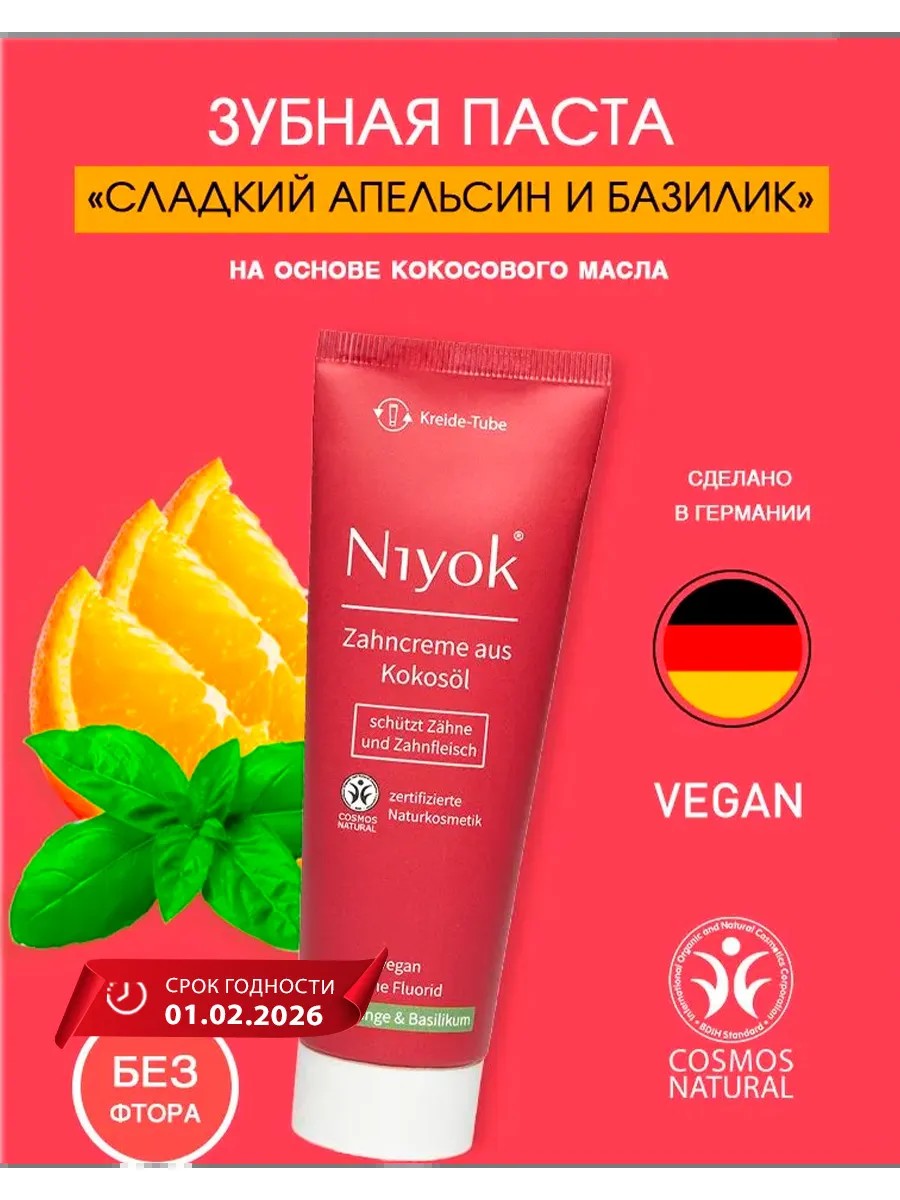 Натуральная органическая зубная паста без фтора и парабенов - мягкая и безопасная зубная паста с кокосовым маслом и экстрактом коры магнолии. Природная формула чистоты и защиты зубов и десен от нежелательных бактерий. Кокосовое масло содержит естественные антимикробные компоненты и подавляет размножение патогенной микрофлоры. Бодрящий цитрусово-пряный аромат тонизирует, освежает и обновляет. Не содержит фтора, подходит для чувствительных зубов и десен. Сертифицированная натуральная косметика COSMOS NATURAL. Подходит для веганов. Niyok (Нийок) – это экологичная и натуральная косметика повседневного спроса из Германии. В результате совместных исследований со стоматологами разработаны уникальные зубные пасты Niyok - использование кокосового масла для ухода за полостью рта, благодаря его эффективному воздействию на микрофлору полости рта и бережному восстановлению слизистой. Концепция марки- сертифицированные и веганские ингредиенты, экологичная упаковка и «прозрачный» состав. Отличная альтернатива синтетическим продуктам!