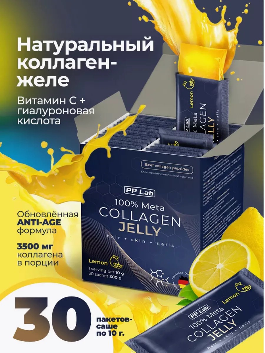 | Composition | citric acid; vitamins A, C, E, D3, B1, B2, B3, B9, B6, B7, B12, B5; hydrolyzed collagen (beef); carrageenan from red algae; ascorbic acid; food flavoring; hyaluronic acid; sodium benzoate; potassium sorbate; sucralose; Natural juice (lemon) |