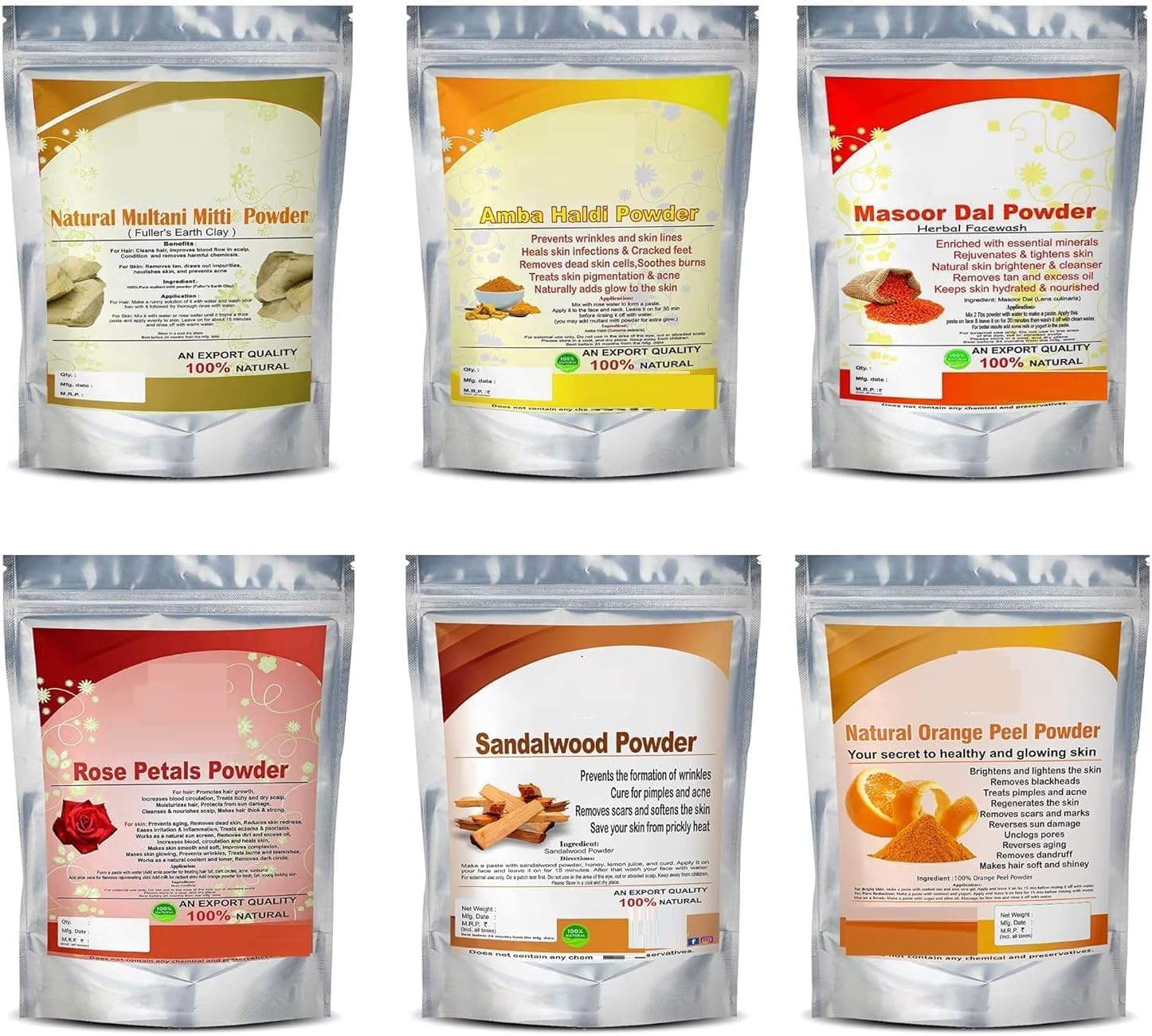 DESCRIPTION DU PRODUIT Face Pack for Healthy and Glowing Skin Combo Pack of Multani Mitti, Sandalwood, Orange Peel, Rose Petals, Masoor Dal, Amba Haldi Powder (Every 50g)